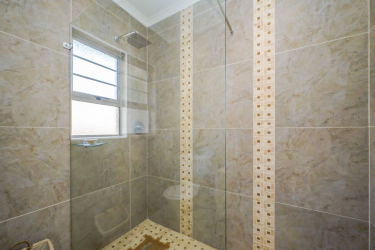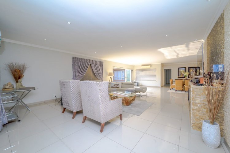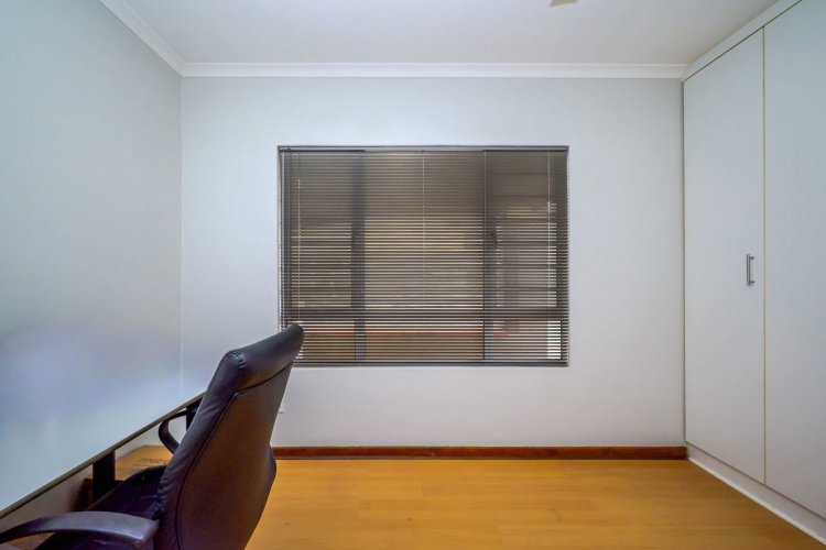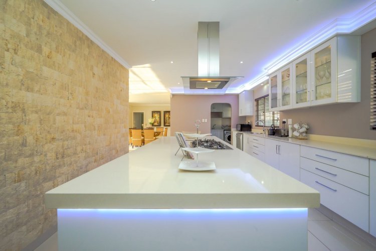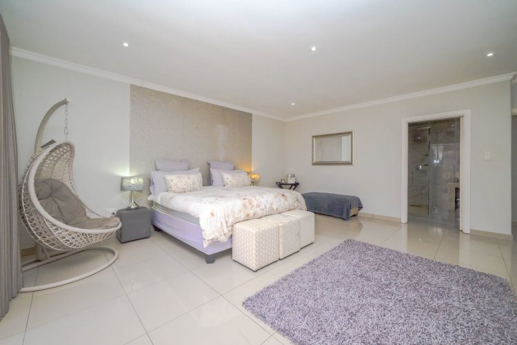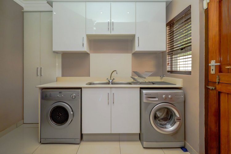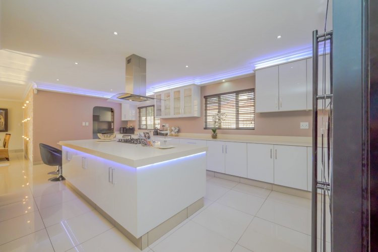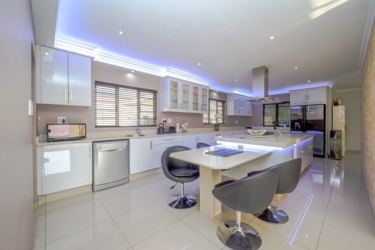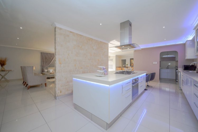 At the heart of the home lies a state-of-the-art gourmet designer kitchen, featuring Caesarstone countertops, soft-close Niemann cabinetry, a Whirlpool gas stove, and an electric oven. A separate scullery and laundry provide additional convenience with ample cupboard space.