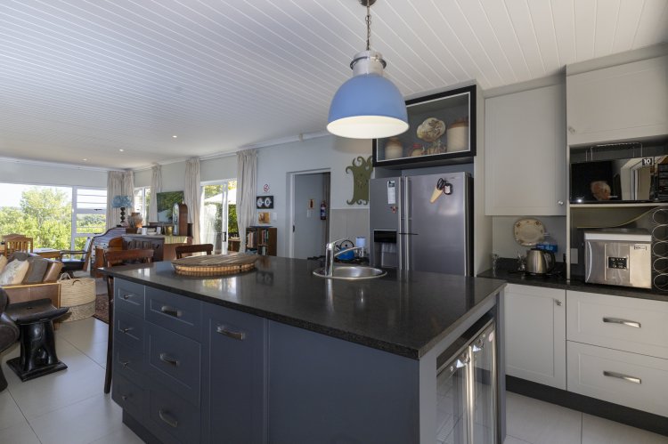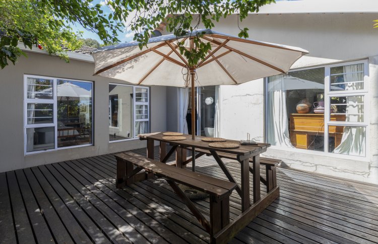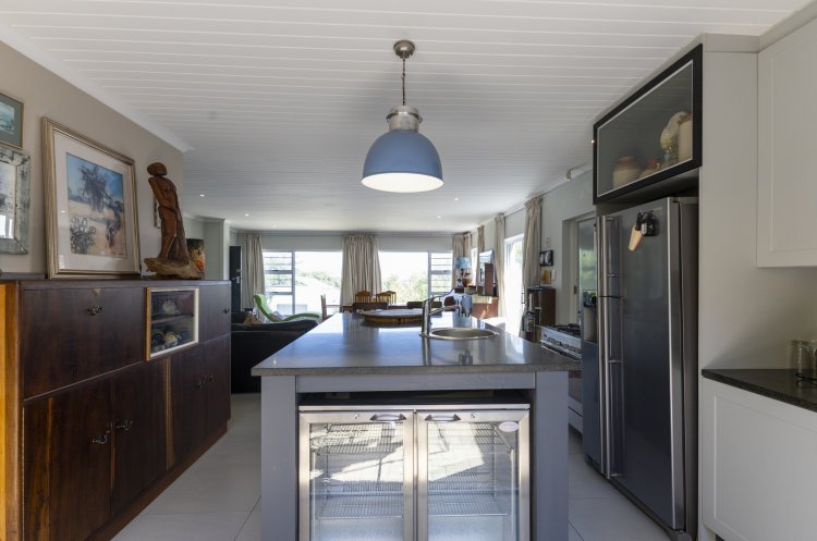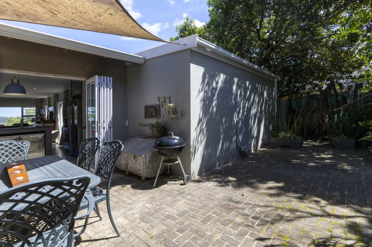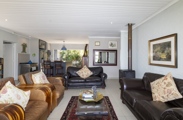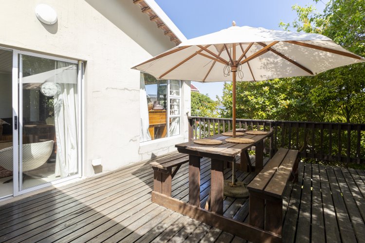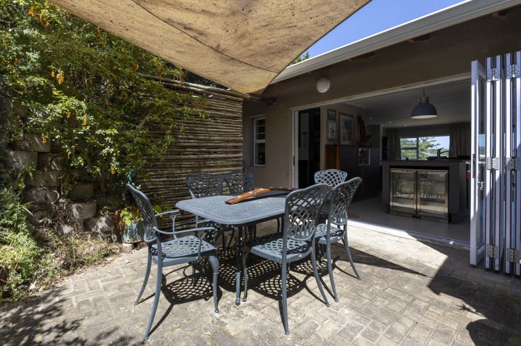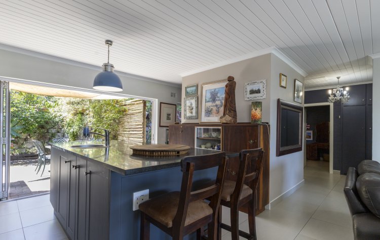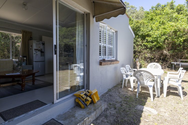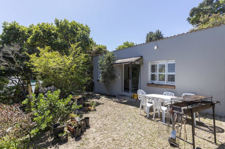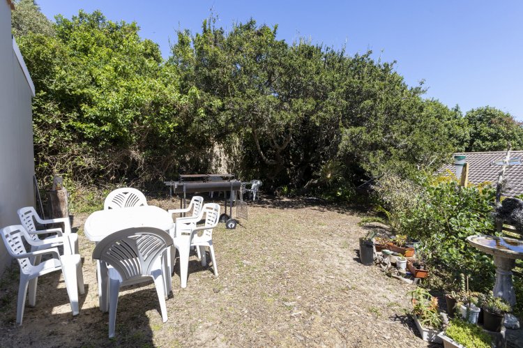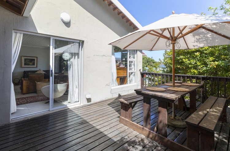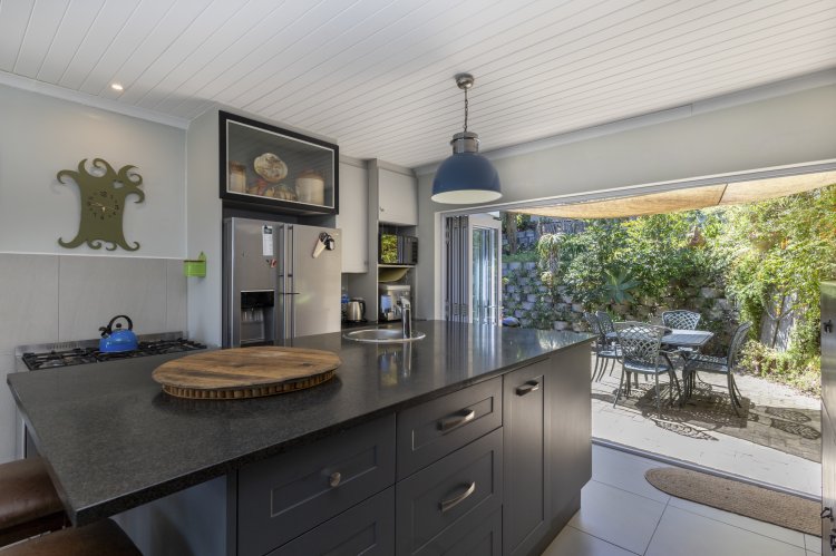 Discover this beautifully renovated home, just a stone’s throw from the beach in Kleinemonde. At the top of the stairs you are welcomed into a generous open-plan lounge, dining area, and kitchen. Abundant natural light floods the interiors through aluminium-framed windows, while a cozy fireplace adds both warmth and atmosphere on cooler evenings. The modern kitchen is a true centerpiece, boasting a sizeable island, modern appliances, and cleverly integrated storage. A discreet scullery with laundry facilities is positioned just off the kitchen. Aluminium stackable doors open effortlessly to a sheltered dining patio, creating a relaxed connection between indoor comfort and outdoor entertaining. From the lounge, double doors reveal a secluded wooden deck. This is an idyllic space to unwind and relax, with a glimpse of the sea from its corner. The luxurious master suite overlooks the deck and features a full en-suite bathroom. On the other side of the lounge there are two additional bedrooms, crafted with the same attention to detail, which share a beautifully appointed bathroom. On the ground level, a spacious double garage has been partly converted into a games room or additional accommodation. Secure parking for one car is available behind a garage door while the other side has an aluminium door and windows. Completing this exceptional property is a charming one-bedroom garden cottage with its own lounge, kitchenette, and bathroom. It is tucked away along a landscaped path, offering a private retreat for guests or versatile extra space.