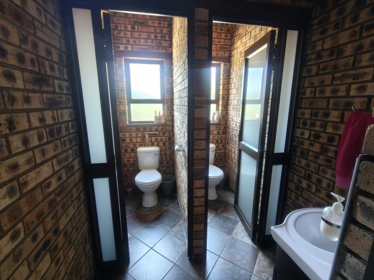 Residential infrastructure includes a very spacious main house with four bedrooms, four en-suite bathrooms, guest toilet, study, walk-in safe, double garage, and a large open-plan lounge, kitchen, and dining area opening onto a wooden deck with breathtaking views. Additional features include a scullery, pantry, laundry, and outside toilet. A second house offers an open-plan lounge and kitchen, glass-enclosed patio, one en-suite bedroom, guest bathroom, large pantry, loft (ideal as a study or second bedroom), and a built-in braai.