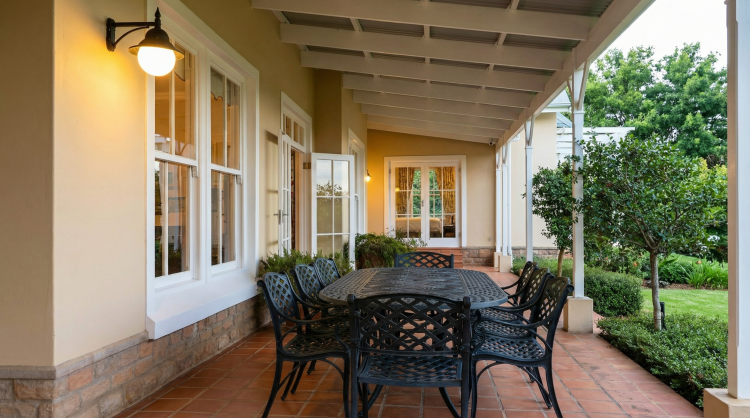 Outdoors, the expansive veranda and garden areas are ideal for entertaining, long lunches, or simply enjoying peaceful mornings overlooking the landscaped lawns. The property’s layout and setting create a true sense of escape, while still offering the convenience of estate living.