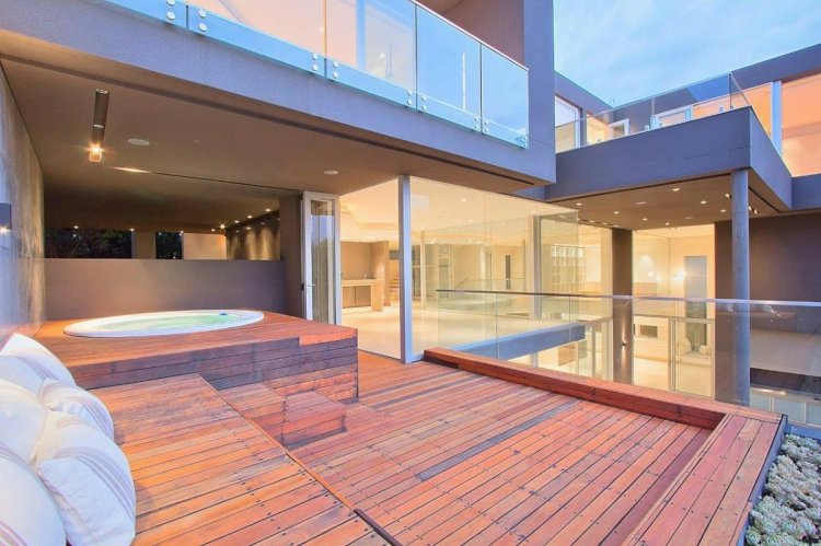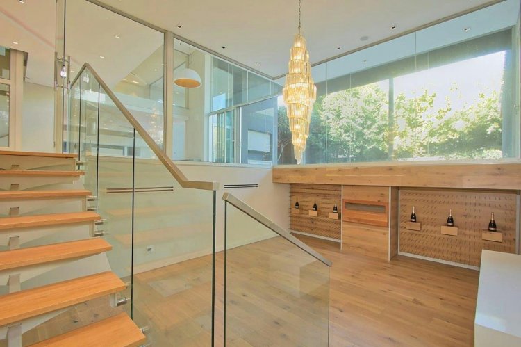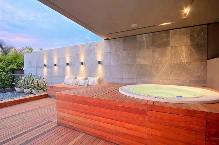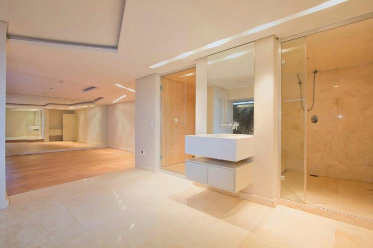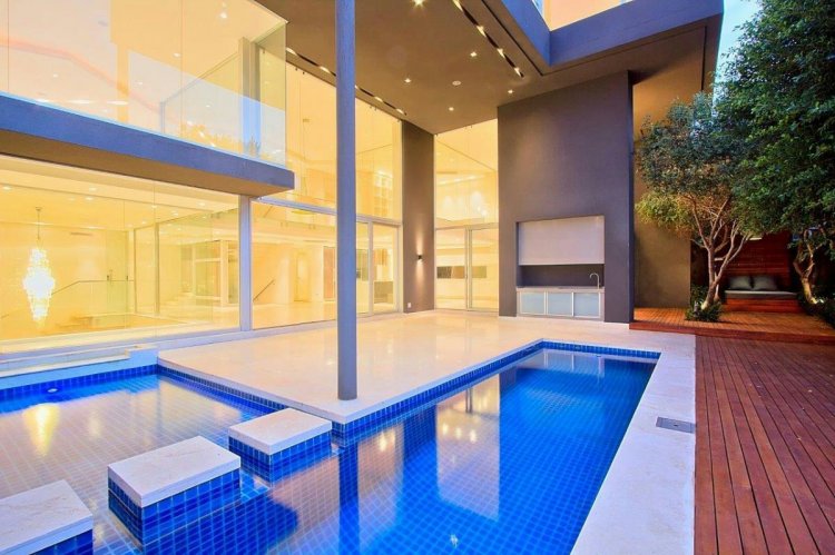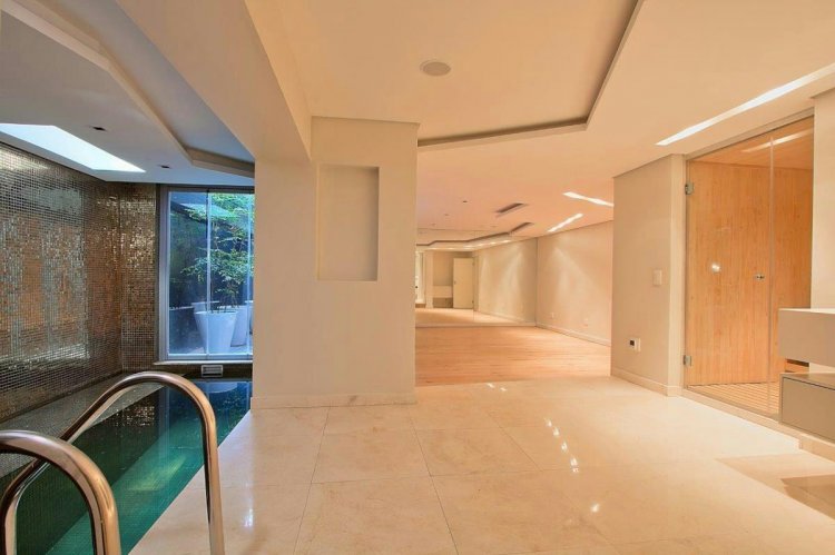 A double-volume staircase and water feature lead to the entrance hall with a reception lounge [sushi granite counter and designer bar] with easy flow to the wooden tan deck & bubbling Jacuzzi. Left-wing showcase an executive office and guest suite. The option of a private lift or stairs is available to go to the basement level boasting a cinema lounge, gym, and health spa comprising of a heated Turkish bath, steam shower, and sauna.
