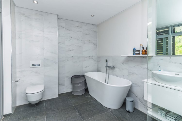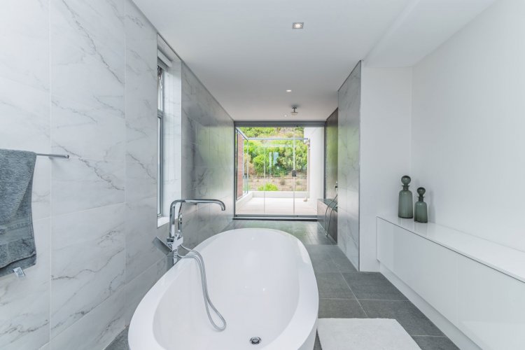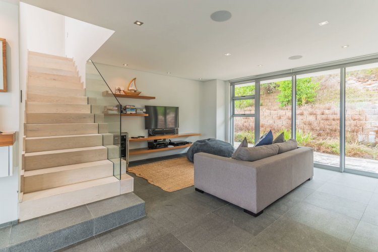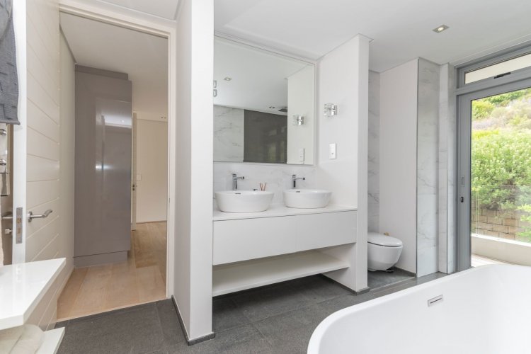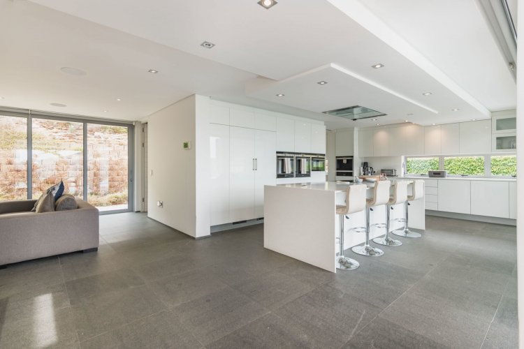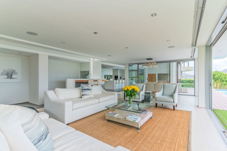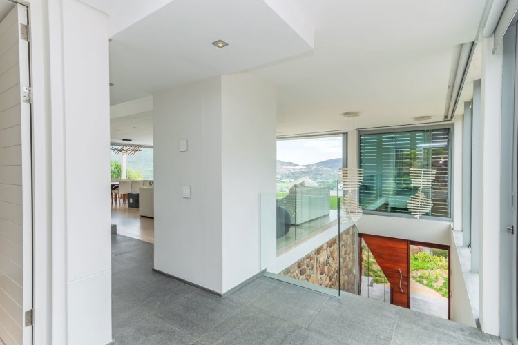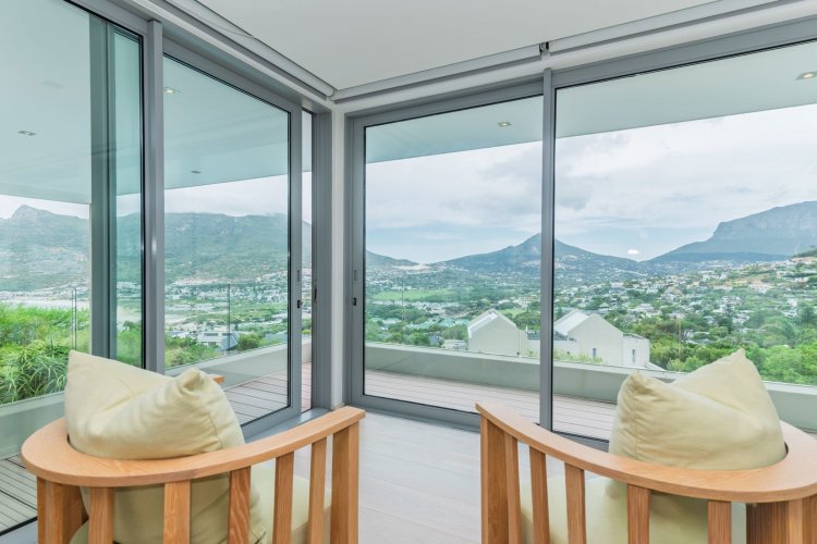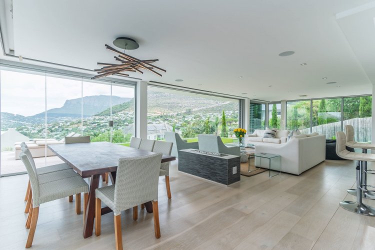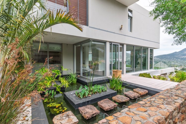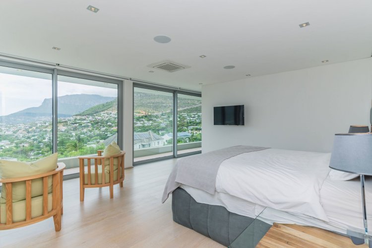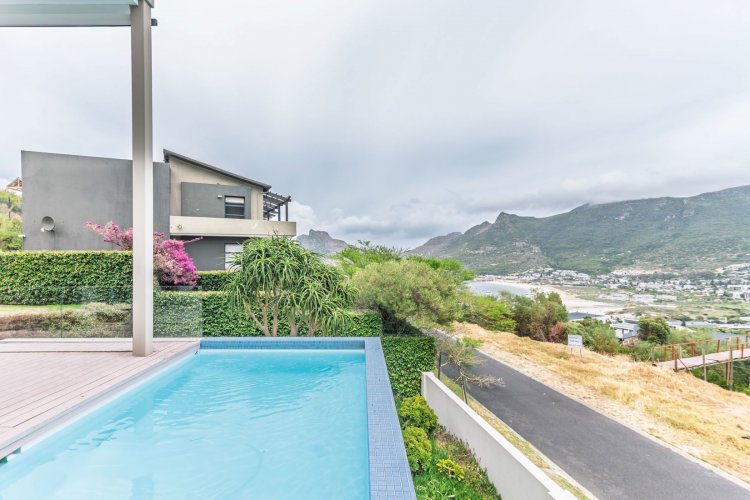Perched on the sought after Hillcrest mountainside in Hout Bay, this luxurious 5 bedroom, 5 bathroom home (4 bedrooms in the main house plus a separate flatlet) offers uninterrupted views of the ocean and the surrounding mountains. This modern masterpiece is an entertainers dream, with impeccable indoor-outdoor living, a beautiful pool, covered patio, koi pond and so much more!