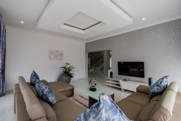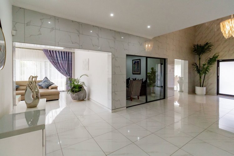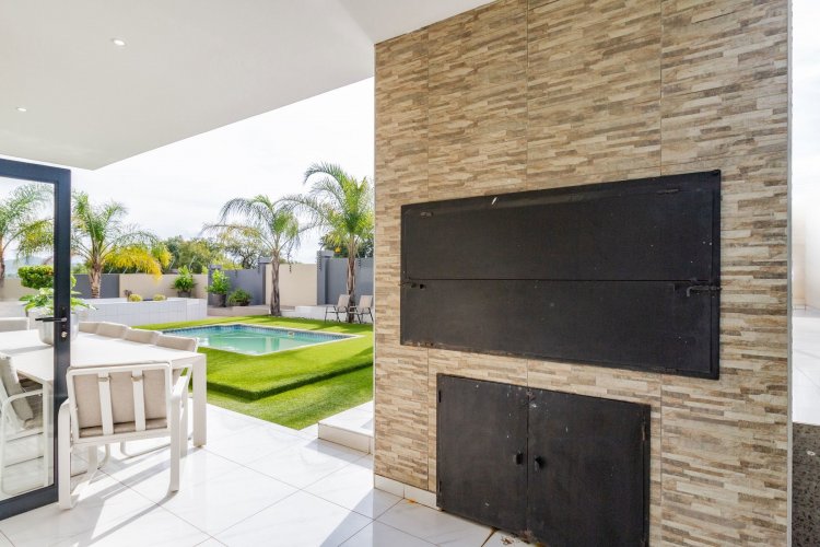 The large open-plan design includes an informal lounge with a fireplace, a private lounge, dining room and cinema room. The informal lounge opens onto an undercover, expansive entertaining area with a built-in braai and boma overlooking a sparkling swimming pool and scenic views. The modern kitchen, equipped with state-of-the-art appliances, features a separate laundry and scullery, and opens onto a magnificent garden with water features and lush green trees.
