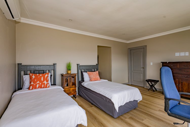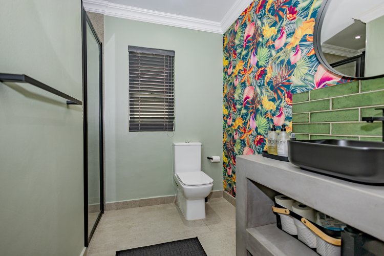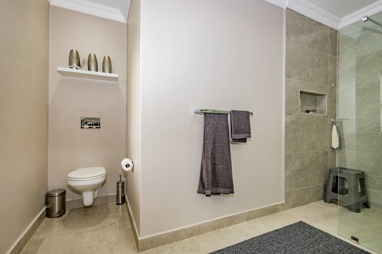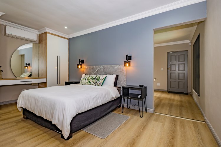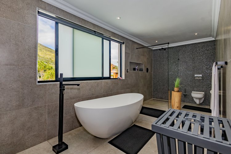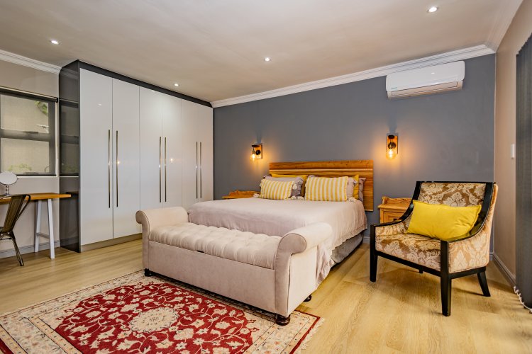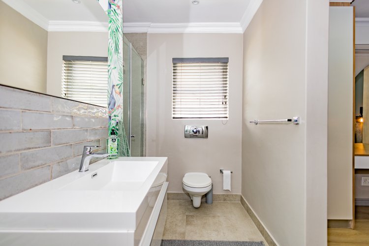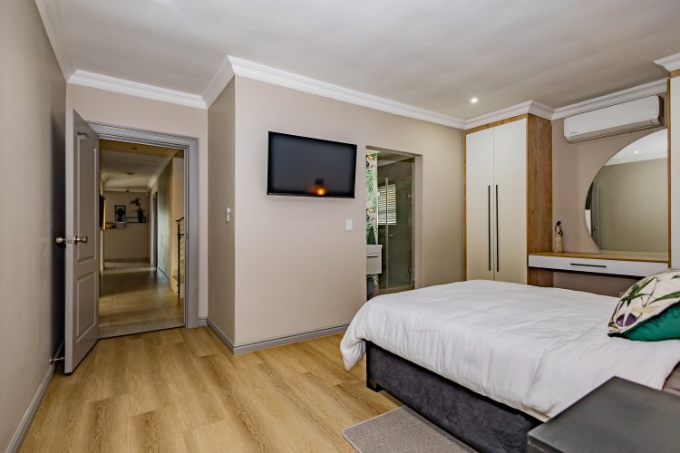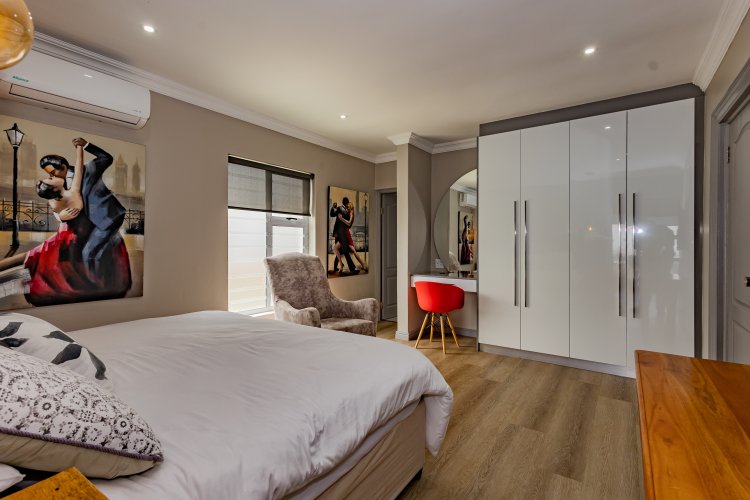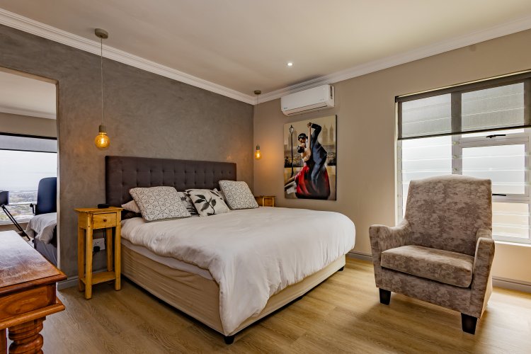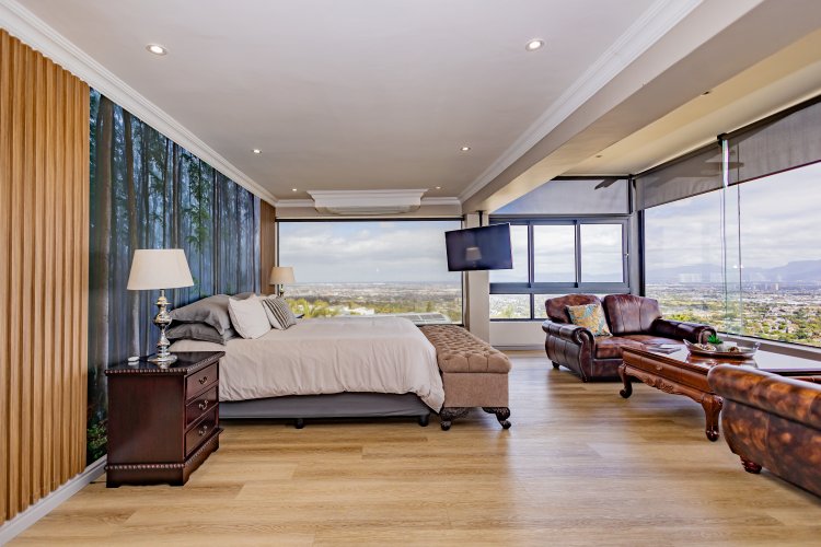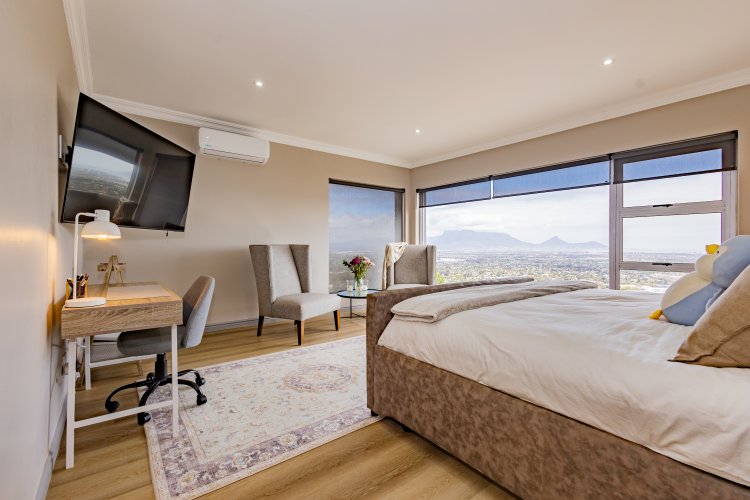 The master suite boasts uninterrupted views of Table Mountain, a luxurious walk-in closet, and a designer bathroom with expansive frosted glass panels that bathe the space in soft, natural light.