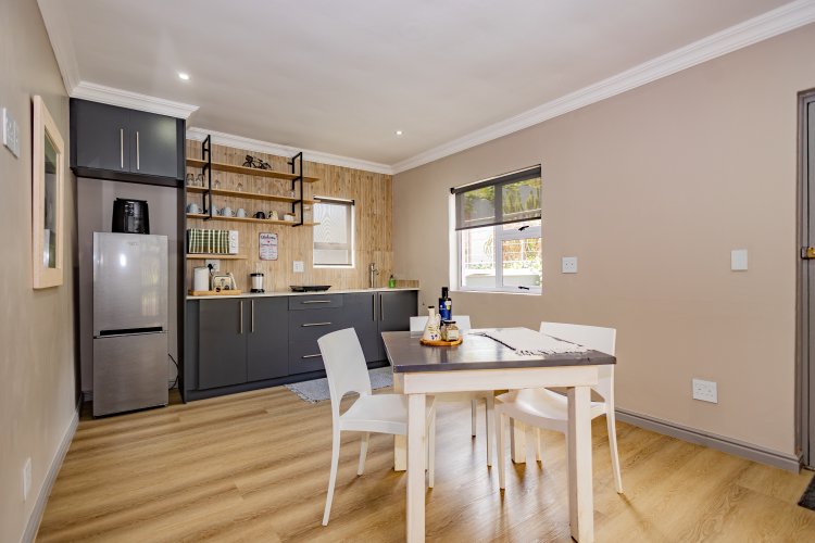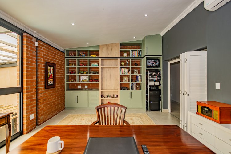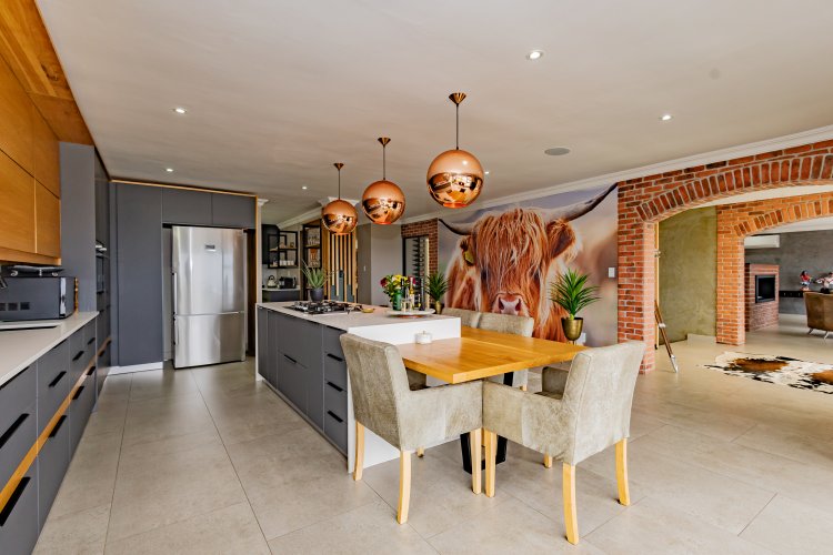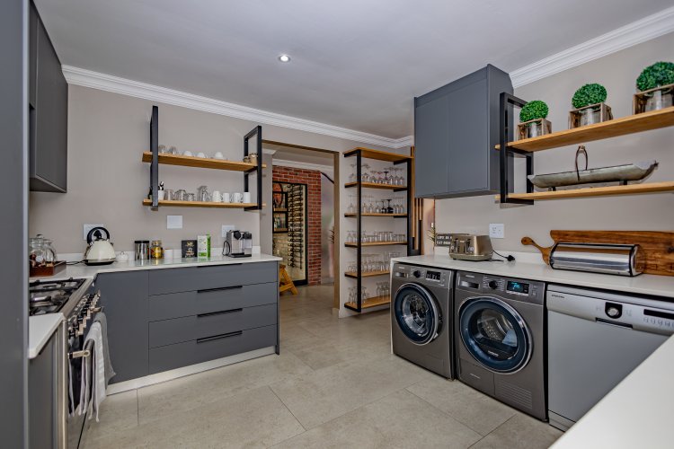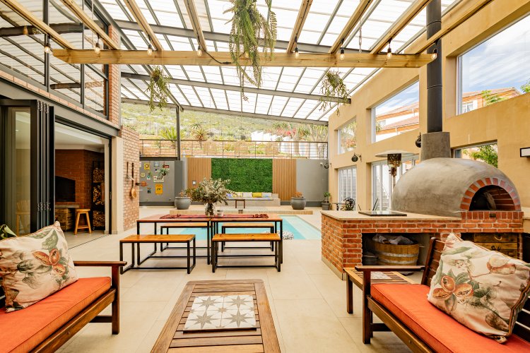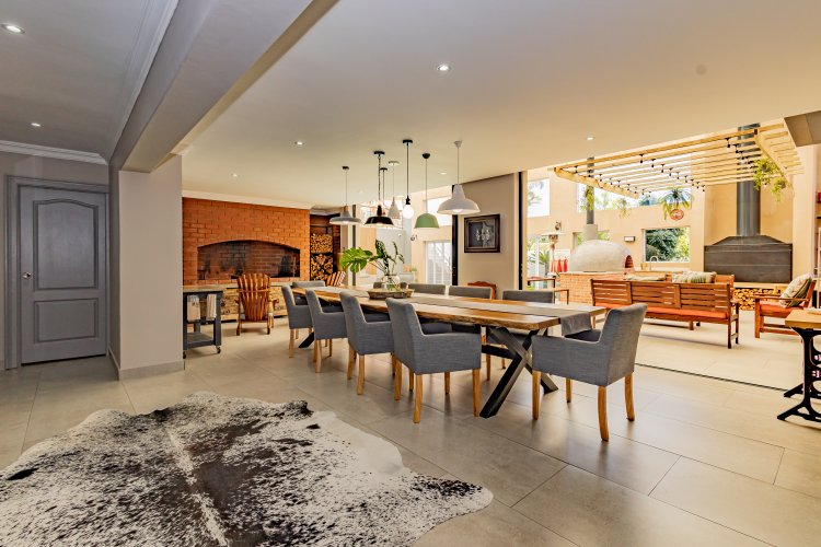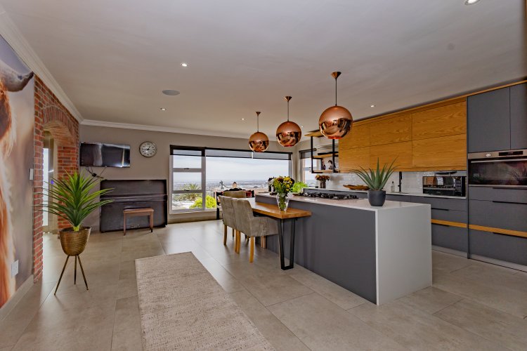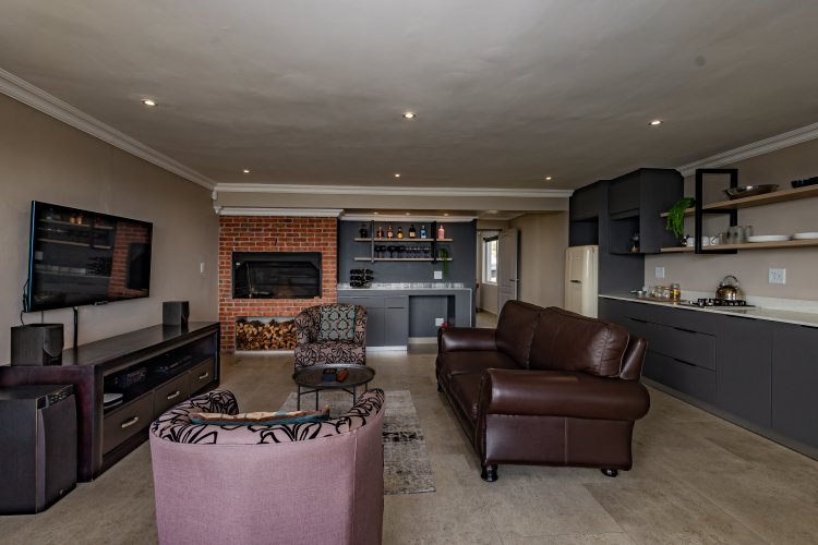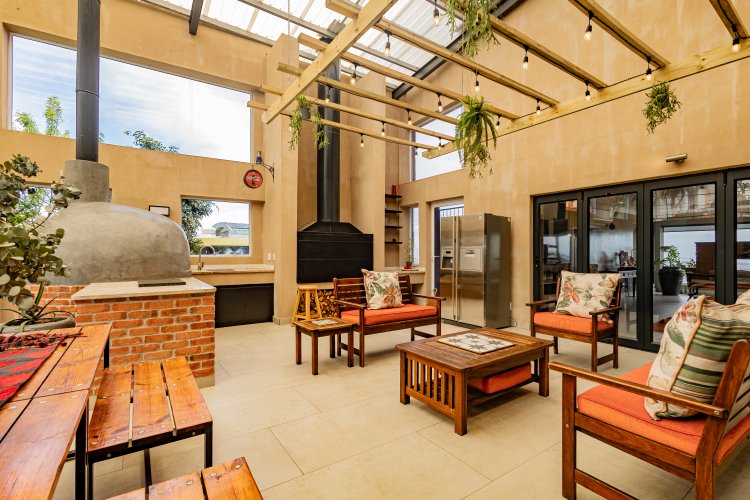 The outdoor entertainment space completes the experience with a built-in braai, pizza oven, and terraced gardens of manicured greenery, including a miniature vineyard, all framed by the tranquil beauty of the Tygerberg Nature Reserve.
