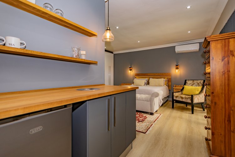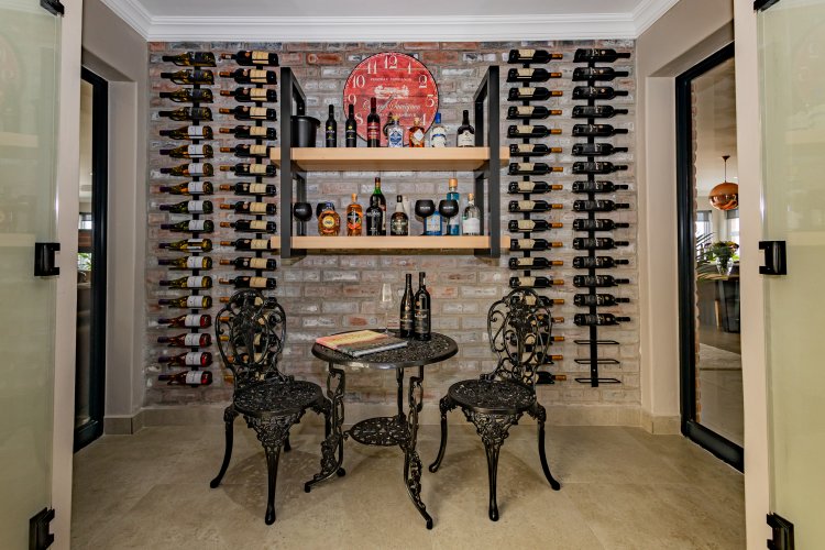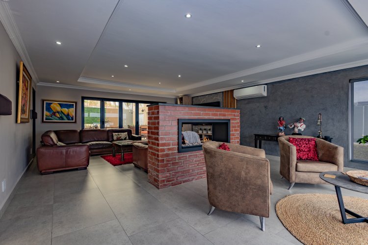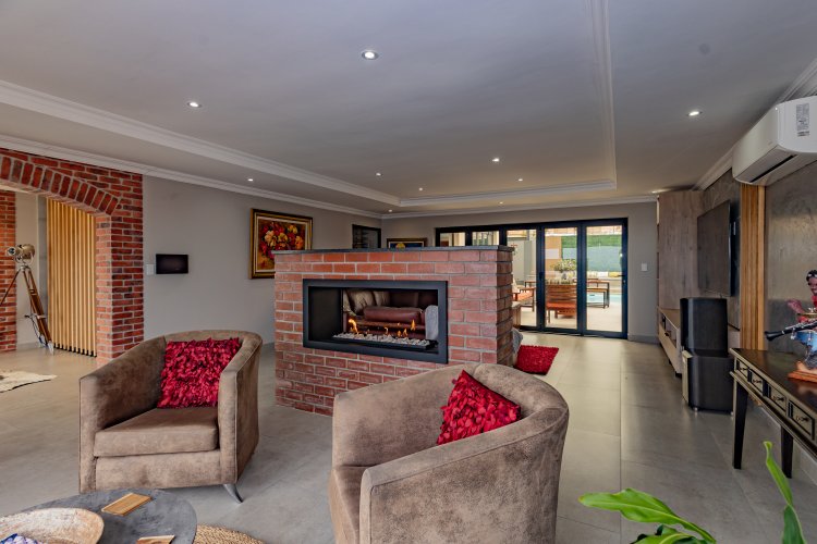 First Floor | The Entertainer’s Haven: The main living and entertainment level is a celebration of warmth and luxury. A spacious lounge with a built-in gas fireplace flows effortlessly through expansive stacking glass doors to the under-roof entertainment patio and heated 25m² pool, creating the perfect setting for hosting guests. The gourmet kitchen features pristine white Caesarstone countertops, bespoke cabinetry, and a full butler’s kitchen/scullery — every detail designed for effortless entertaining. Beyond the kitchen lies an elegant dining hall with a statement fireplace and two glass-fronted wine cellars softly backlit to create a warm, inviting ambiance — the perfect setting for unforgettable evenings. A private guest suite, complete with a kitchenette and ensuite, opens directly onto the pool terrace — ideal for visiting family or friends.