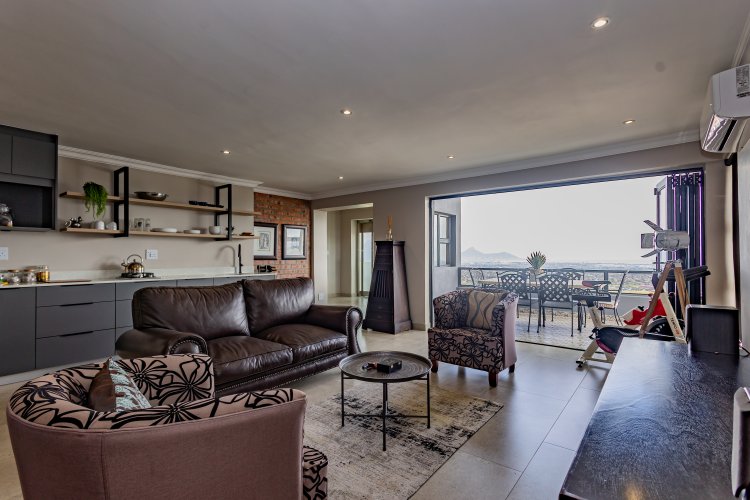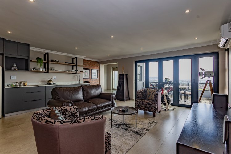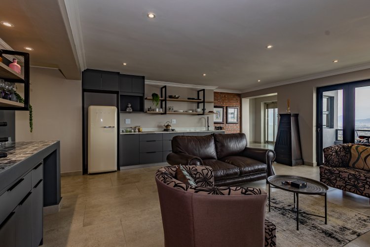 A private living area with a built-in braai and kitchenette opens onto a panoramic patio, where the city skyline and mountain horizon unfold in breathtaking detail. A guest cloakroom completes this refined, self-contained space — an oasis of calm above the city.