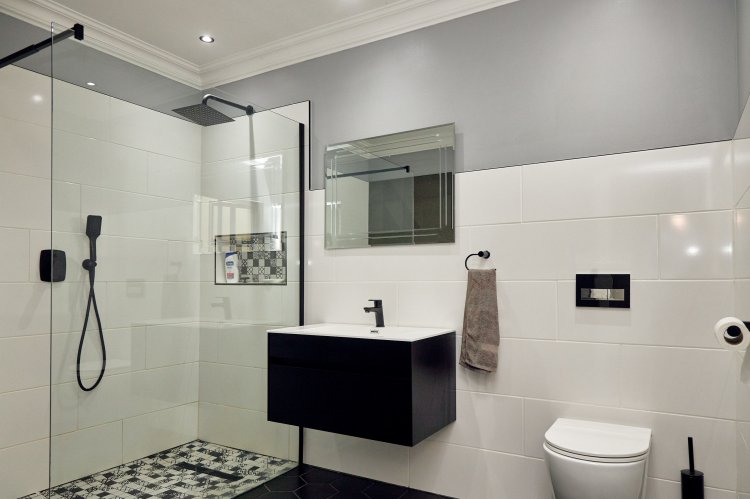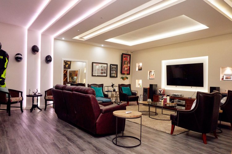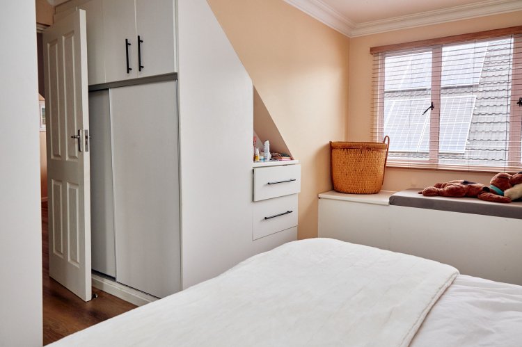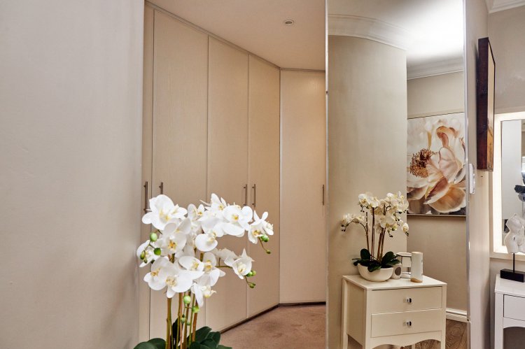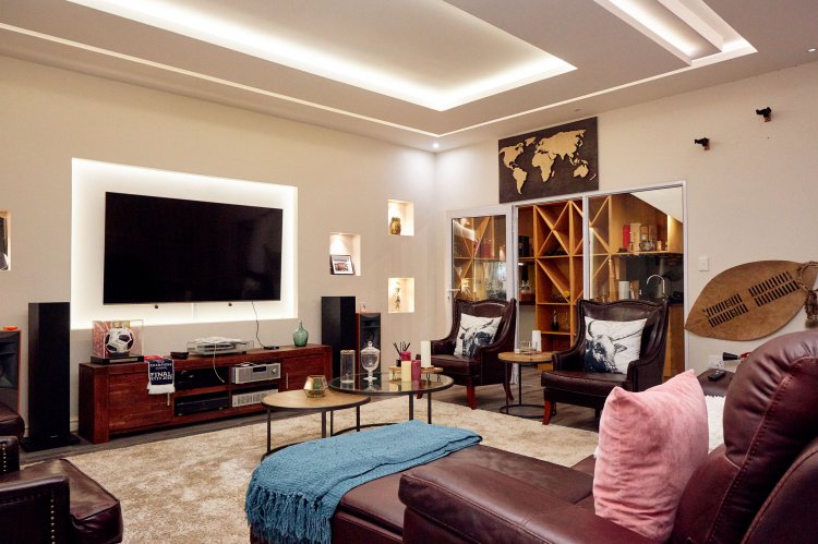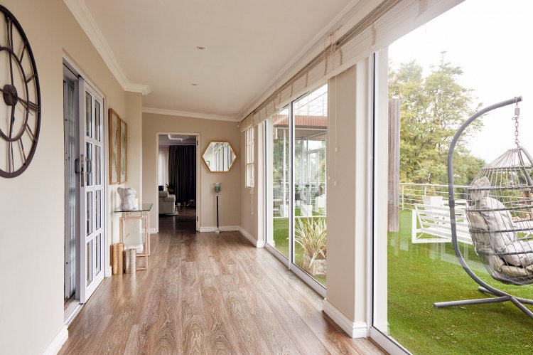 The main en-suite deserves special mention. Designed as a private retreat, it spans two levels. The lower level holds a cosy lounge and kitchenette, leading down into a stylish man cave with a glass-fronted wine cellar and walk-in safe. Upstairs, the bedroom opens to a balcony and features an open-plan his-and-hers wardrobe and exposed en-suite. A sunroom just outside adds another quiet space to pause and enjoy the surroundings. The patio is finished in astroturf for easy, low-maintenance living.