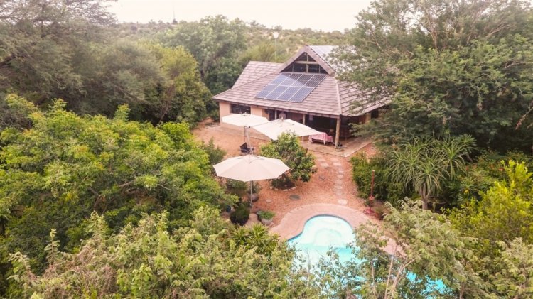Additional features include a solar system comprising 22 solar panels, 10 Pylontech batteries and inverter; borehole and 5,000L water tank, garden shed and secure elephant-proof fencing around the main homestead.