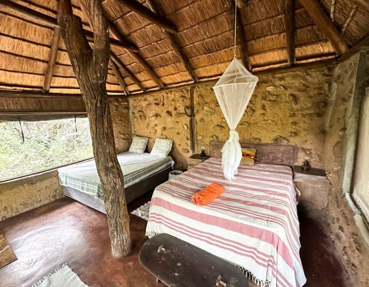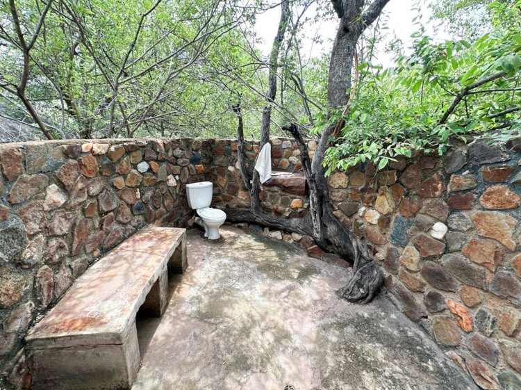 Set approximately 500 metres from the main homestead, the rustic bush camp delivers an immersive wilderness experience. It includes multiple stone-and-thatch, canvas-sided sleeping units (main en-suite), open-air bathrooms, an open-plan kitchen and dining area, and a separate dining area and day bed — perfect for unforgettable gatherings under the stars. The camp is fenced with electric elephant fence.