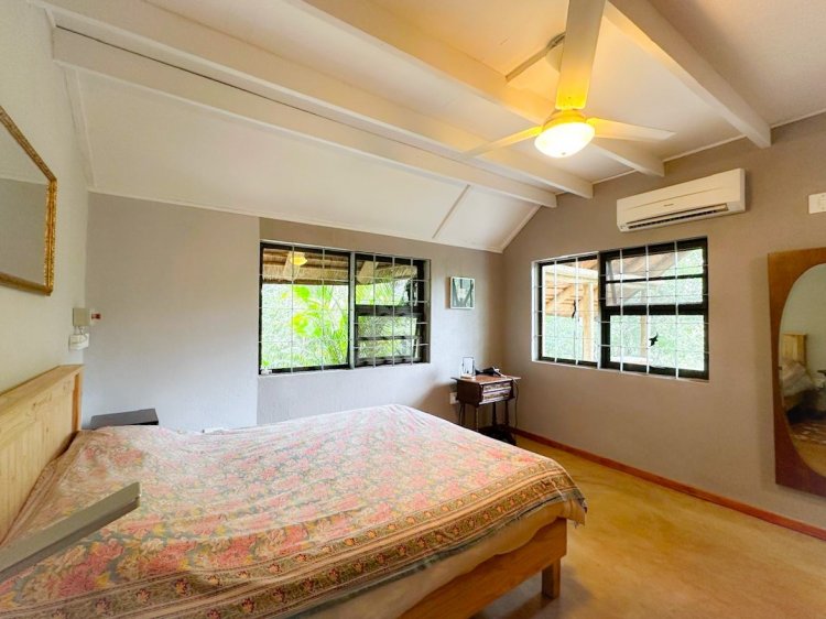 The fully off-grid main home features quality finishes, screed floors and a Harvey Thatch Tile roof. A spacious lounge, library and well-equipped kitchen (gas stove and electric oven) flow onto a covered thatched patio overlooking the pool and surrounding wilderness. The air-conditioned main bedroom includes built-in cupboards, an en-suite bathroom and a distinctive outdoor bath with bush views. A loft provides flexible space for an office or additional accommodation, while a separate guest bathroom adds convenience.