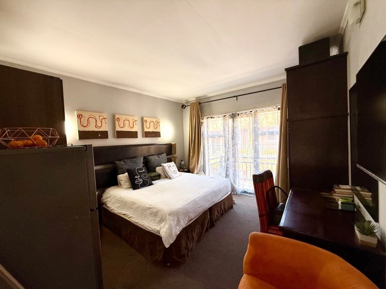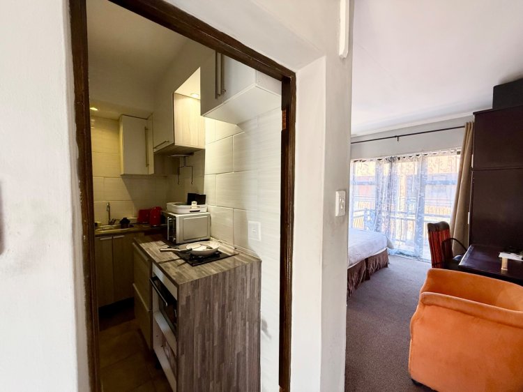 The apartment features a bright open-plan layout with a neat kitchen and a spacious bedroom leading to a private balcony.