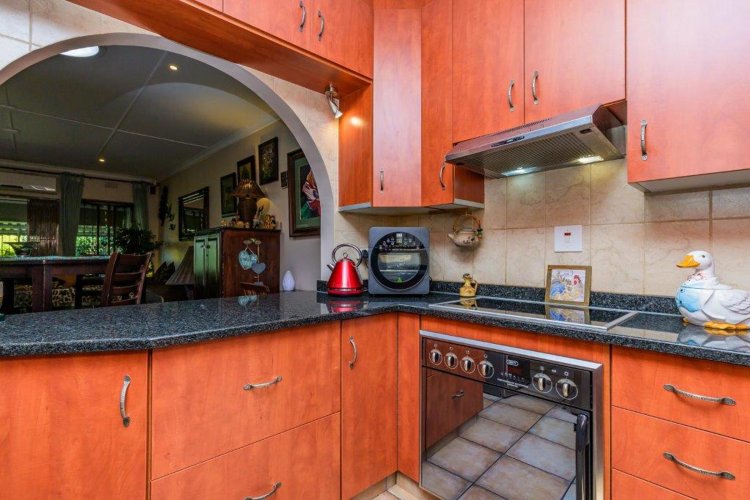 Inside, the layout is both welcoming and practical. The kitchen is thoughtfully designed with ample wooden cupboards, sleek dark granite countertops, and built-in appliances comprising a hob, oven, and extractor fan. An elegant arched doorway links the kitchen to the generous open-plan living and dining space, creating an easy flow for everyday living. The air-conditioned lounge opens via sliding doors onto a covered patio, providing an ideal setting for entertaining or unwinding.