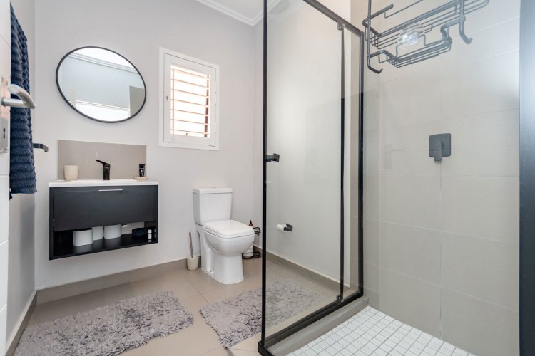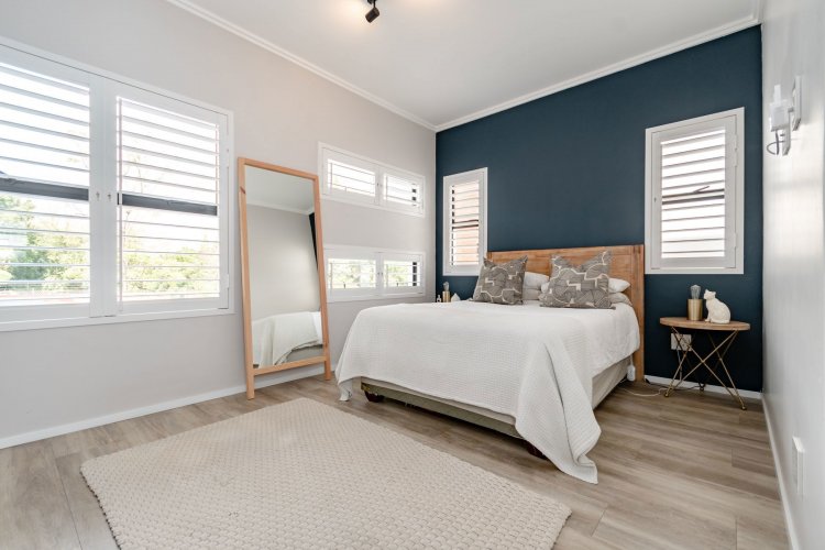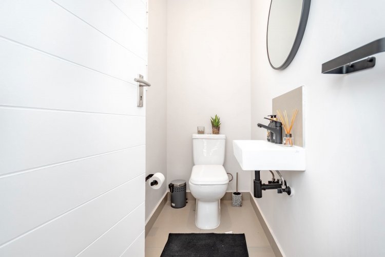 A guest cloakroom is conveniently located downstairs, while aluminum security shutters throughout the home provide peace of mind.