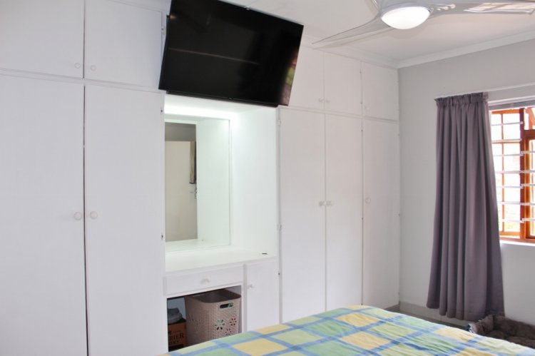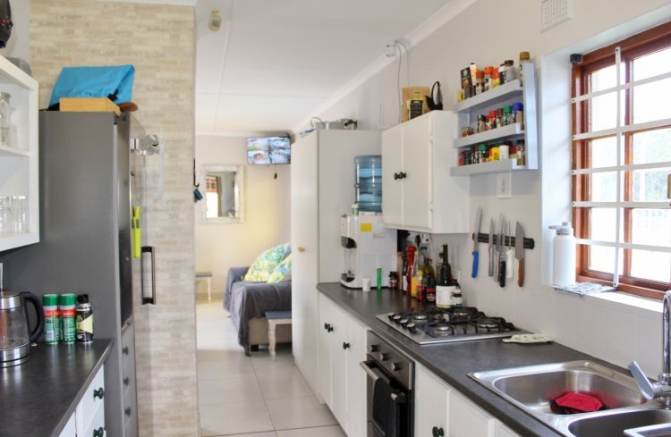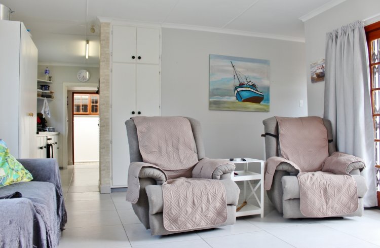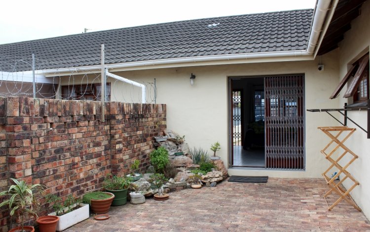 This neat and well maintained two bedroom sectional title home offers comfort, convenience, and security within easy walking distance of the shops and town. The fully enclosed, pet friendly front garden is secured with palisade fencing. The home opens to a spacious open plan living area with freshly painted walls and newly tiled floors, creating a bright and welcoming space. Wooden French doors lead from the lounge onto a private patio, ideal for relaxed mornings or peaceful evening drinks. The functional kitchen features timber cabinets, postform countertops, a double sink, an undercounter oven, a gas hob, and a broom cupboard, making everyday cooking easy and practical. The courtyard outside the back door has been transformed into a covered entertainment area with a built in braai, perfect for hosting friends or enjoying quiet evenings. This space also provides access to the single, longer than average freestanding garage with an automated door, as well as visitor parking in front. A paved driveway leads to the garage and is accessed via an automated gate, with palisade fencing securing the entrance. A side door from the garage adds extra security. The courtyard also accommodates two rainwater tanks plumbed to the house for convenience if there is a municipal water issue. Additional features include a ceiling fan in the lounge, an alarm system, burglar bars, and trellidor gates on all doors, offering a secure and low maintenance home close to town.