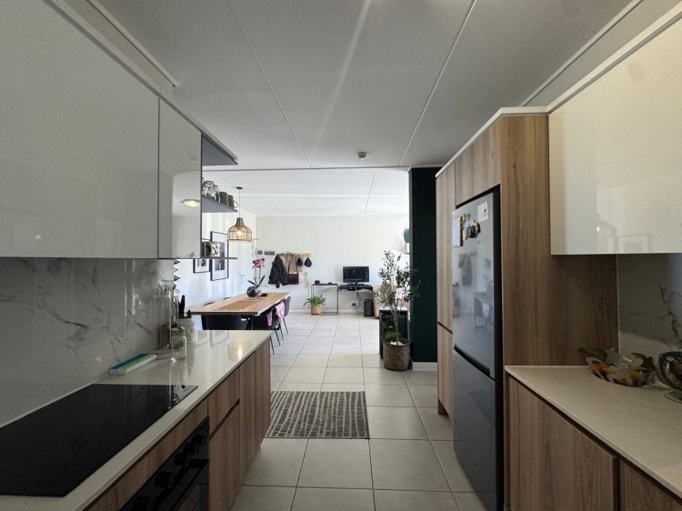 The open-plan kitchen, dining, and living area flows seamlessly onto a spacious private garden, ideal for entertaining, relaxing, or letting pets roam freely. The modern kitchen features sleek finishes and ample storage, designed for both style and functionality. Appliances included