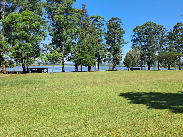 The home features an open-plan kitchen and lounge area that leads onto an enclosed verandah, which overlooks the lake.