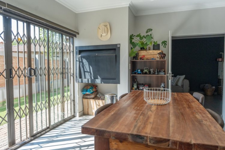 Stacking doors lead out to a charming patio with a built-in braai, overlooking the beautifully maintained garden - the perfect space for effortless indoor-outdoor living.