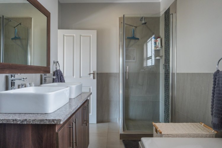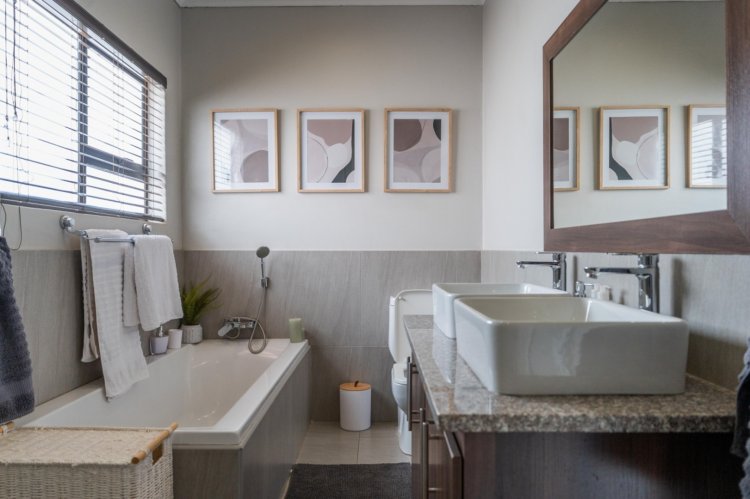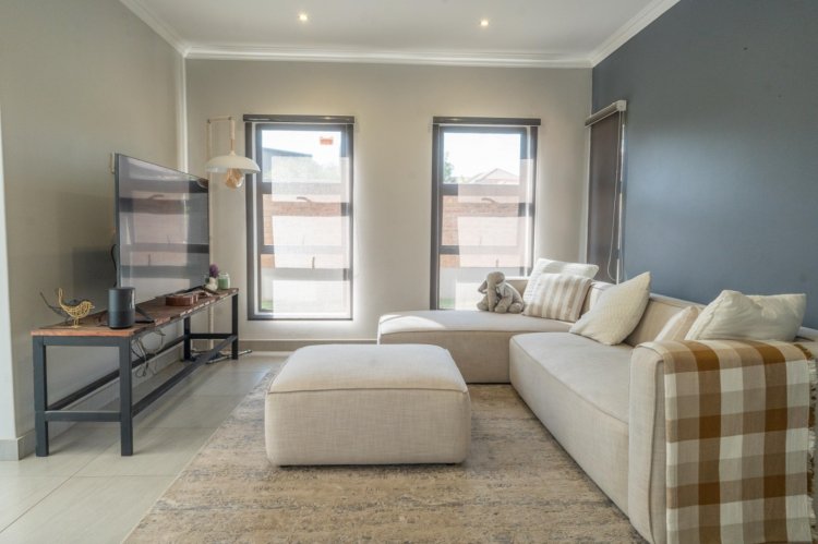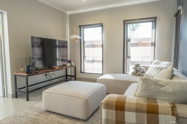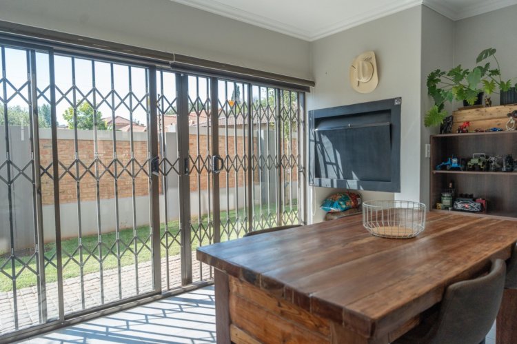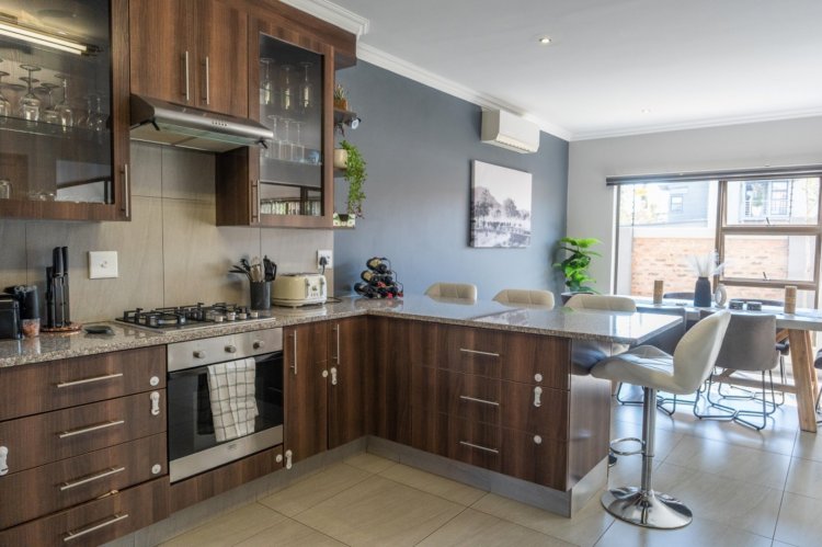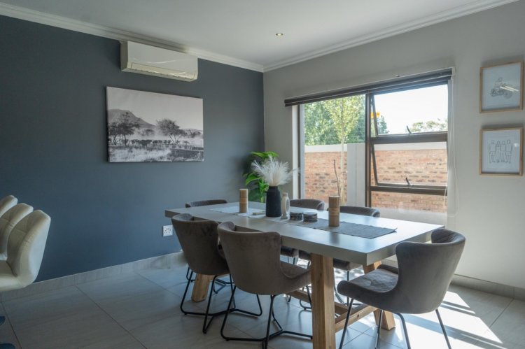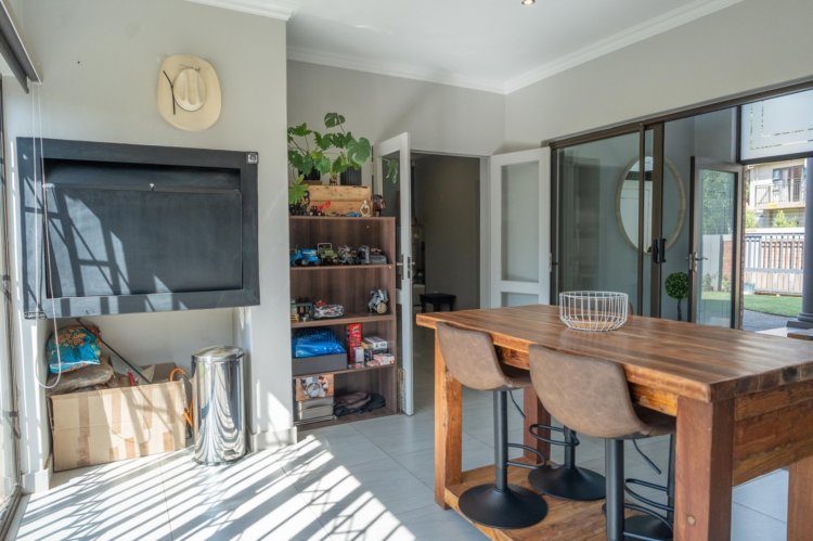 The heart of the home is the open-plan kitchen and dining area, thoughtfully designed for seamless everyday living. The kitchen is stylish and functional, complemented by a separate scullery to maintain a clean and organized main space. An air-conditioner in the dining area ensures comfort throughout the seasons, creating an ideal setting for both family meals and entertaining.