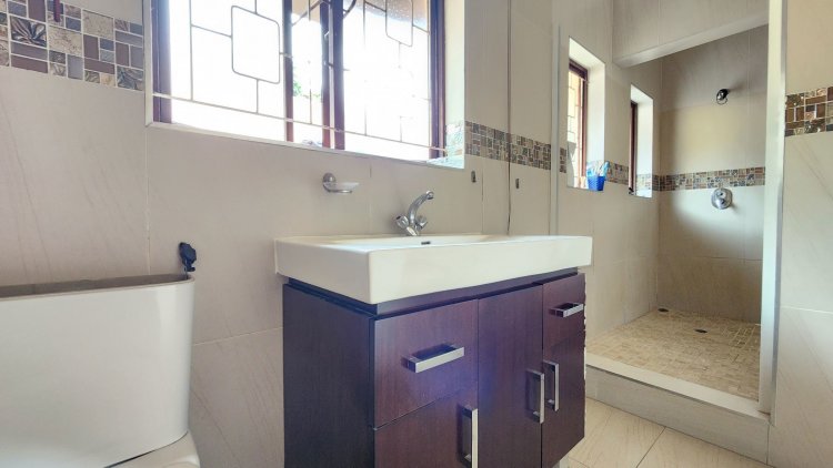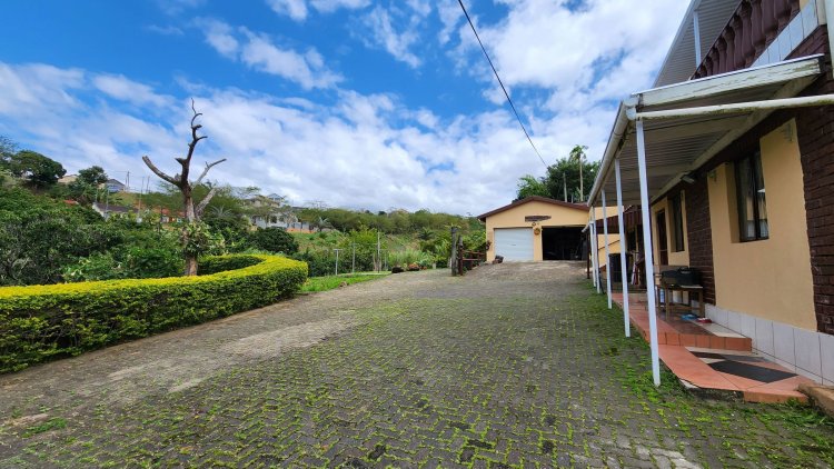 The main house features 3 bedrooms and 2 bathrooms, including a main ensuite. There's a separate dining room and a bright living area that opens onto a balcony overlooking the garden, creating a peaceful spot to relax or entertain. The kitchen is neat and functional, offering ample cupboard space.