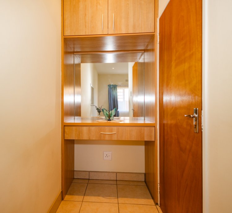 Two spacious bedrooms are located downstairs, both fitted with built-in cupboards and tiled throughout for easy maintenance.