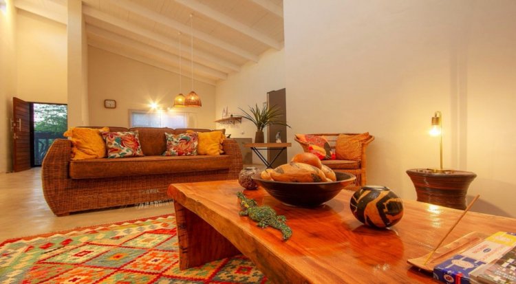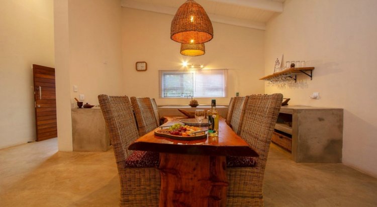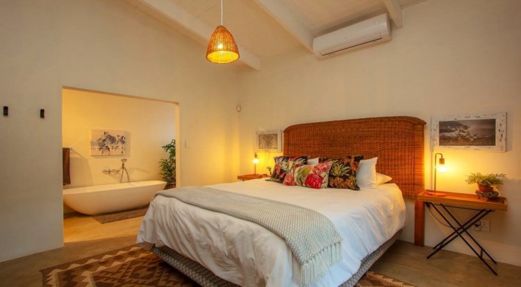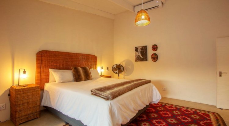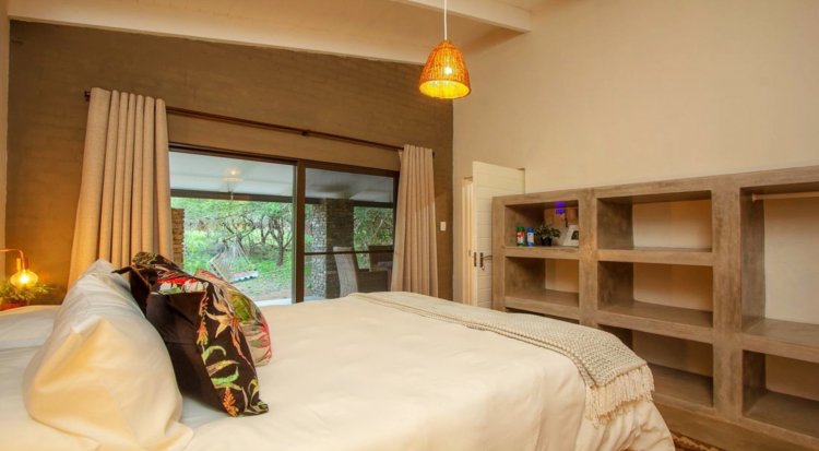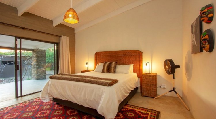 This beautifully designed residence offers three spacious bedrooms, each with its own en-suite bathroom. The main bedroom boasts a luxurious en-suite complete with a stunning outdoor shower, offering both privacy and a unique connection to nature. All three bedrooms open directly onto the patio, where you’ll find a built-in braai, sparkling blue pool, and an inviting boma braai area—ideal for relaxed afternoons or memorable evenings under the stars.