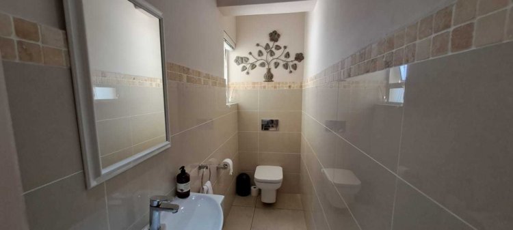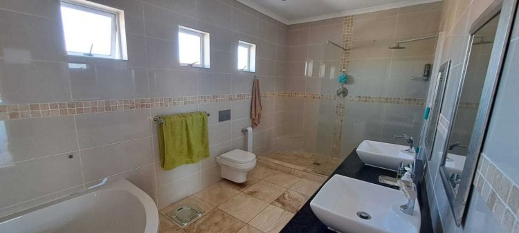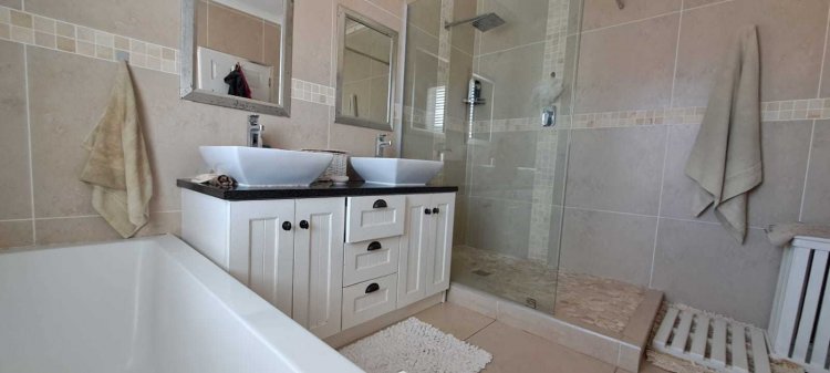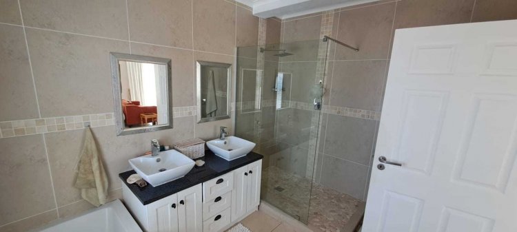 This spacious home offers three generously sized bedrooms, each with an en-suite bathroom. One bedroom on the ground floor is perfect for dual living, featuring a kitchenette, sliding doors to a private patio, and an outdoor braai facility. Another private guest suite awaits, overlooking a lush garden, providing the perfect retreat for visitors. Upstairs, the master suite is a sanctuary, with a walk-in closet, a luxurious bathroom featuring his-and-hers basins, and a private balcony where you can enjoy panoramic views.