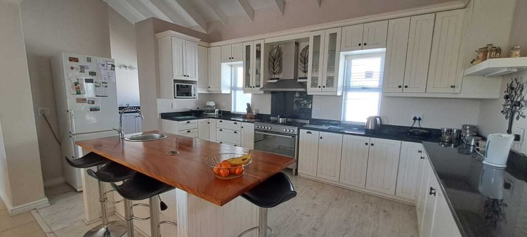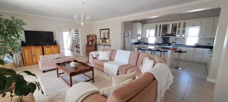 Step inside and be greeted by a bright, open-plan living space that flows seamlessly with natural light streaming through large windows. The modern kitchen is a chef’s dream, complete with a 5-burner gas stove, center island, and a separate scullery. The dining area opens up onto an undercover patio and private braai area, ideal for outdoor entertaining in a tranquil setting.