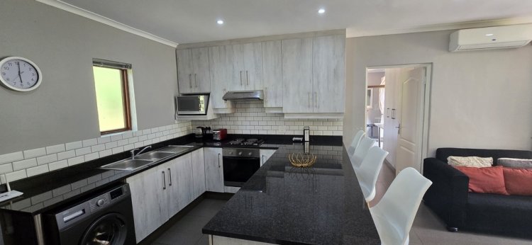 The home offers an inviting open-plan kitchen and living area that flows seamlessly to a private braai space, perfect for relaxed entertaining.