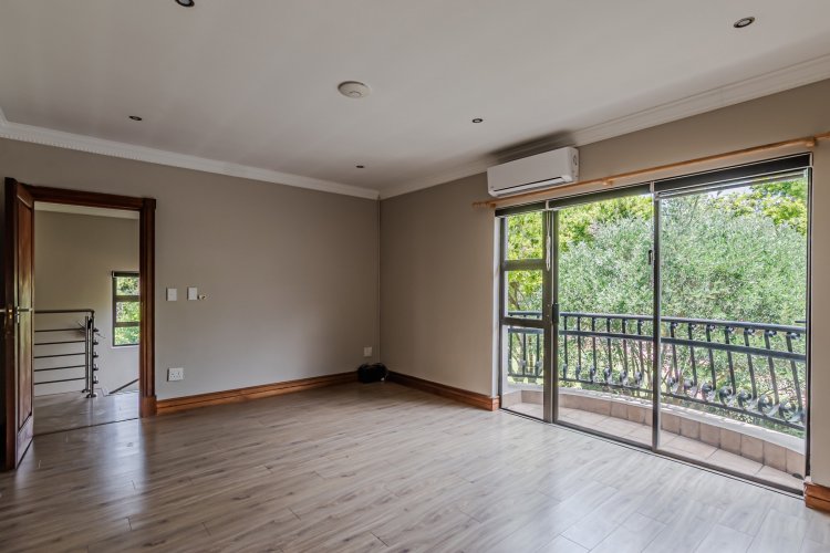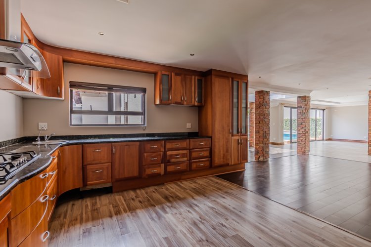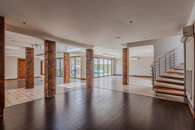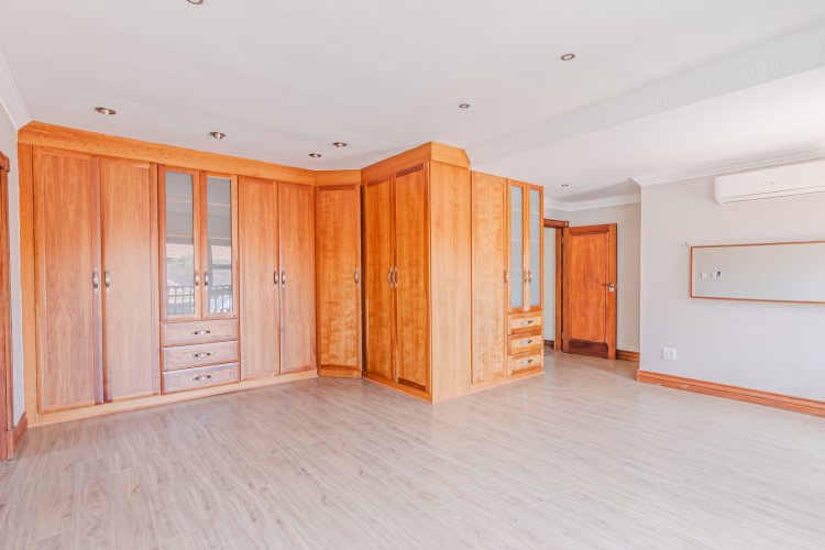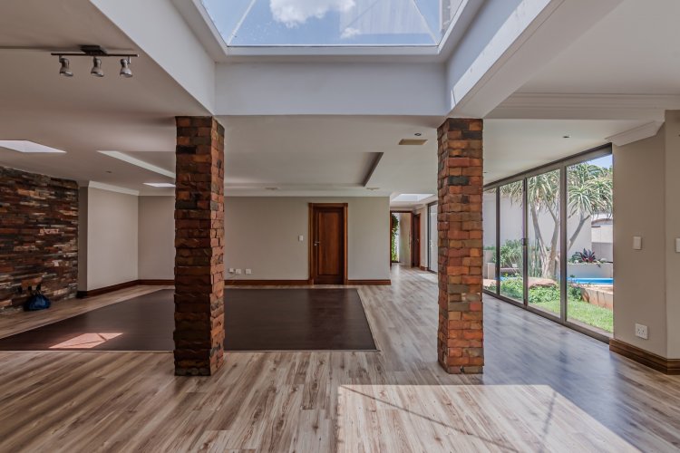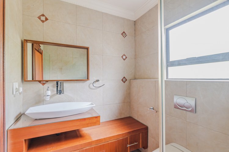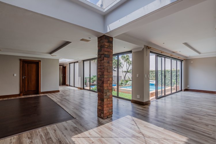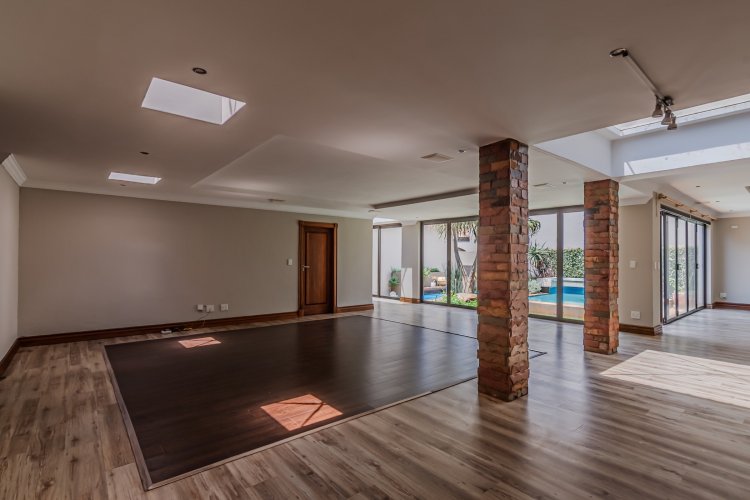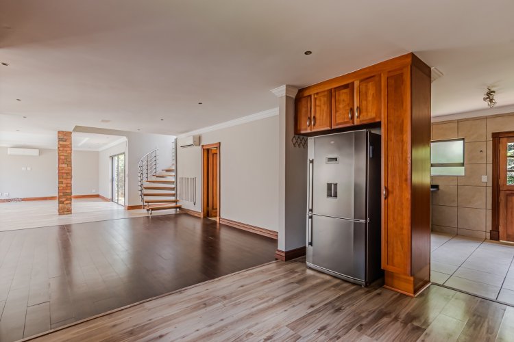Downstairs features expansive open-plan living areas, including a dining room and two lounges, creating the perfect space for both relaxation and hosting guests. The large, well-appointed kitchen offers ample workspace and is complemented by a separate scullery for added convenience. A private study with a door leading out to the garden provides an ideal work-from-home area or quiet space to unwind, and there is also a guest bathroom.