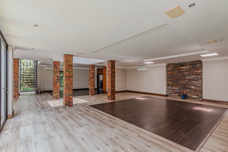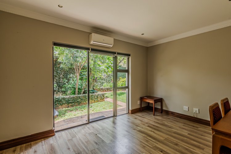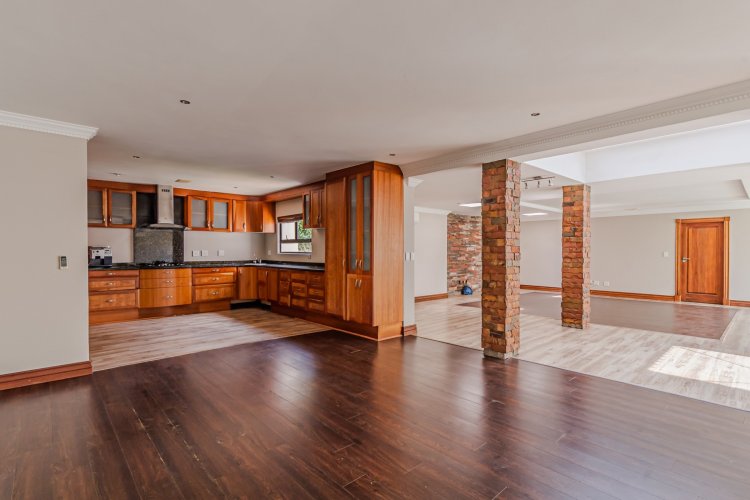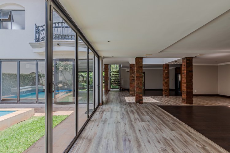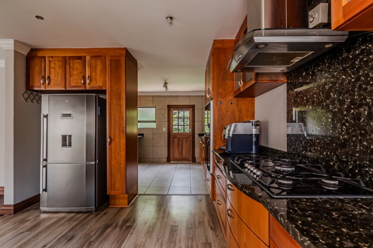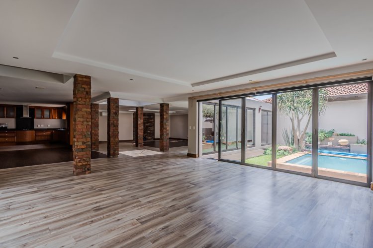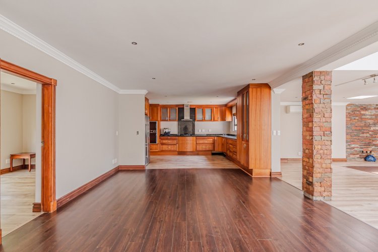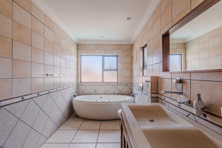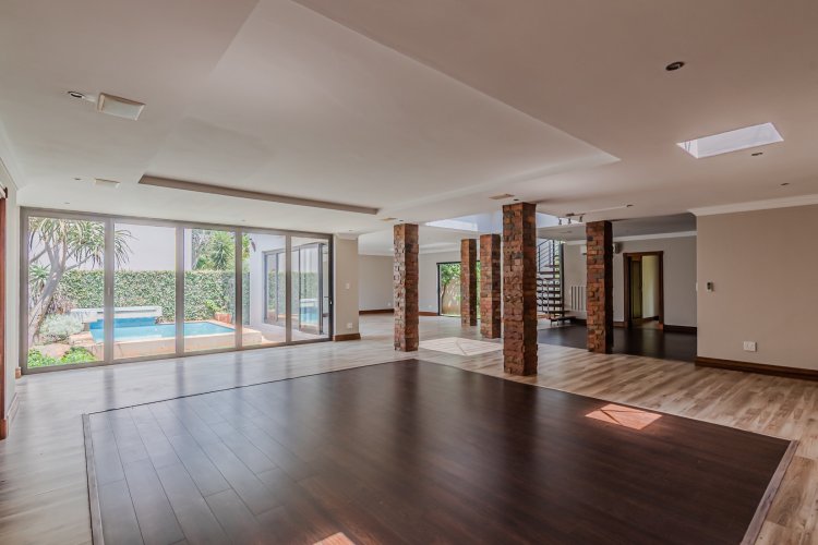 Downstairs features expansive open-plan living areas, including a dining room and two lounges, creating the perfect space for both relaxation and hosting guests. The large, well-appointed kitchen offers ample workspace and is complemented by a separate scullery for added convenience. A private study with a door leading out to the garden provides an ideal work-from-home area or quiet space to unwind, and there is also a guest bathroom.