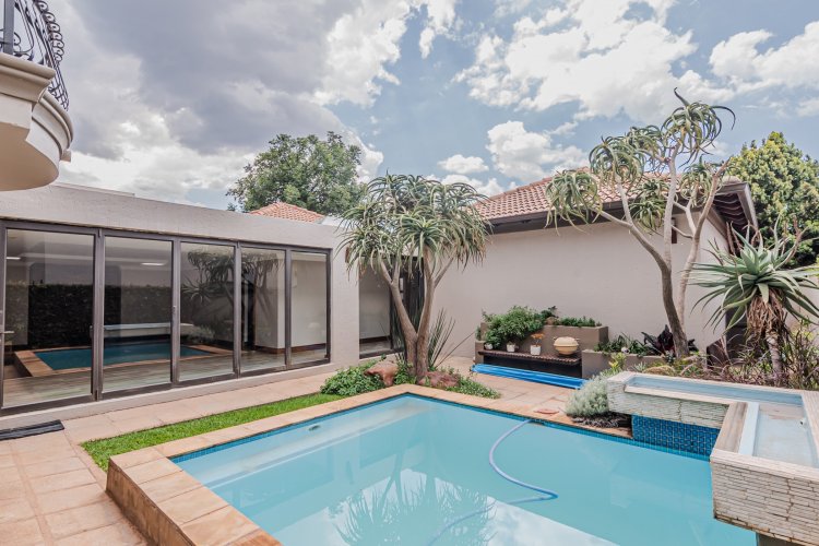 The living areas open out to the garden and swimming pool, allowing for seamless indoor-outdoor living and creating a beautiful setting for gatherings or relaxed afternoons at home. This house also offers two double garages.