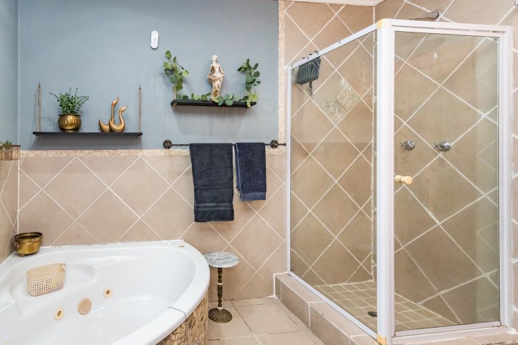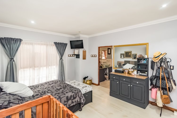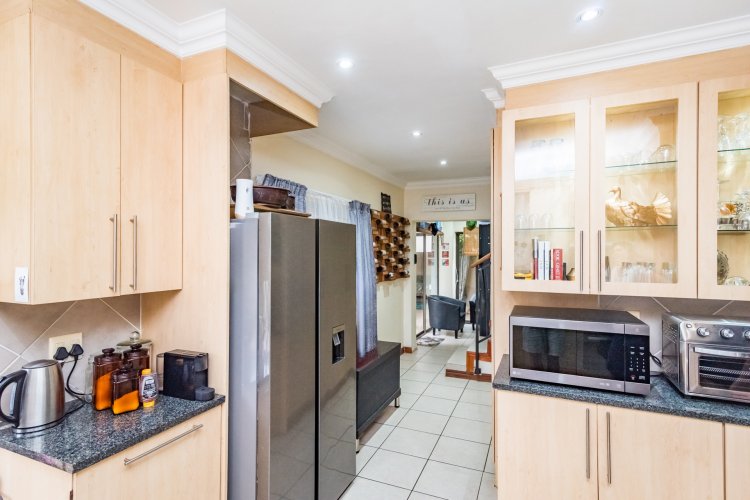 The stylish, contemporary kitchen is well-appointed with ample built-in cupboards, a dishwasher connection, space for a double-door refrigerator, and an electric stove. The kitchen flows seamlessly into both a private courtyard and an inviting enclosed patio featuring a built-in braai—perfect for effortless entertaining with family and friends.