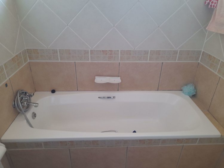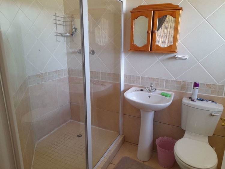 There are three tiled bedrooms, all with built-in cupboards. The main bedroom includes an en-suite bathroom with a bath, shower, toilet, and basin, while a second bathroom with a shower, toilet, and basin serves the rest of the home.