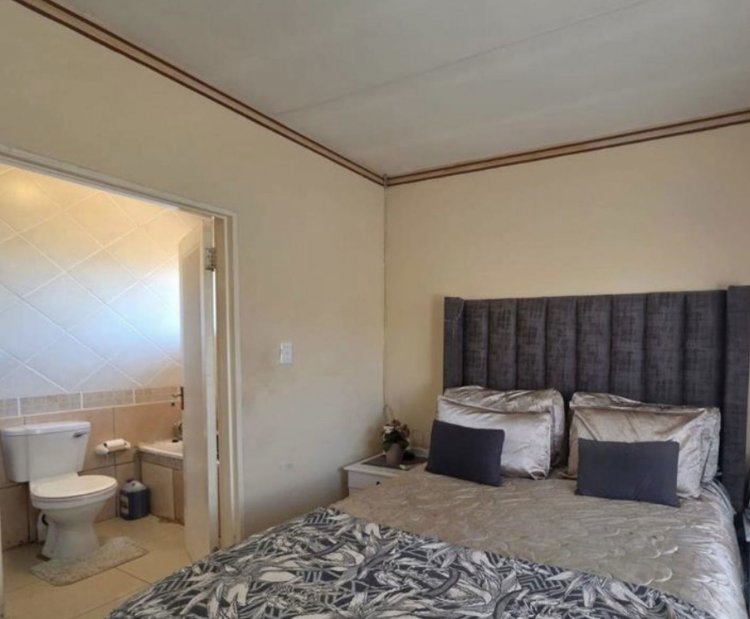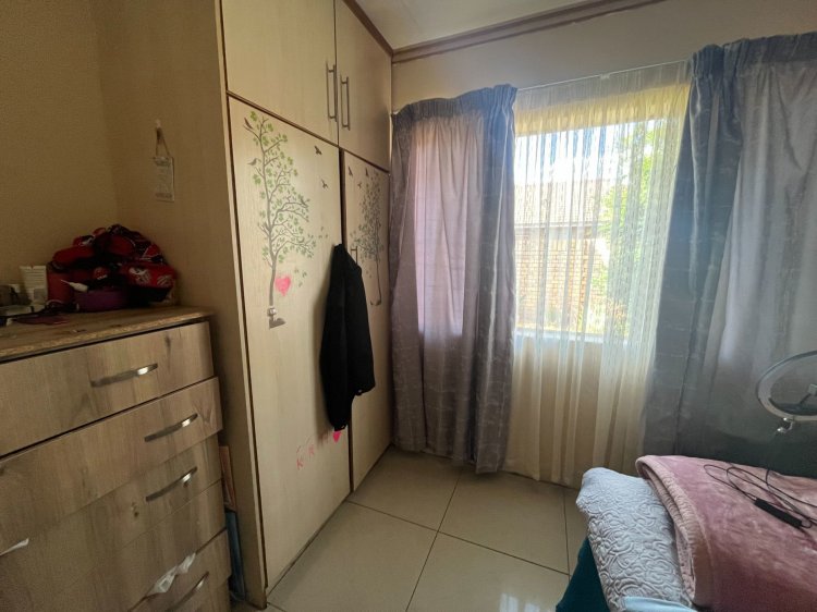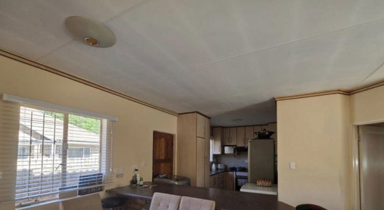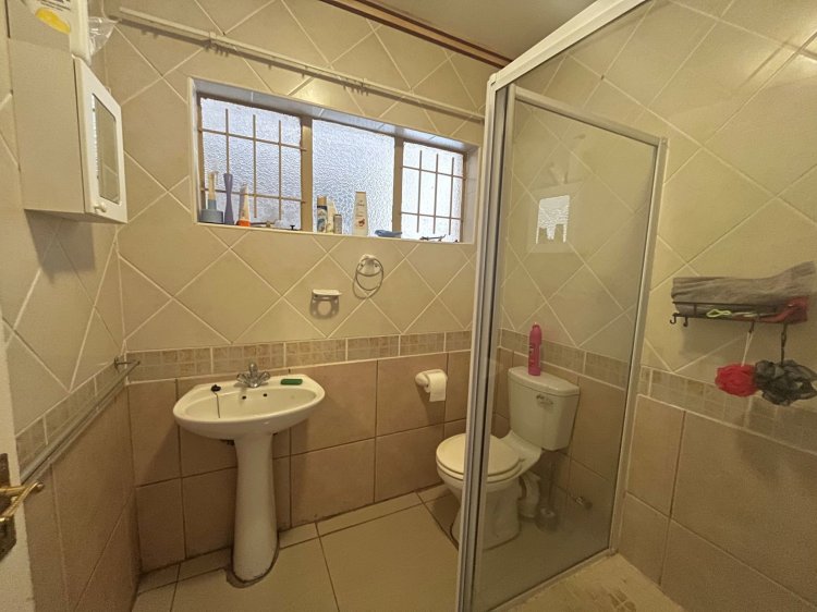 The home welcomes you with a fully tiled, open-plan living area that feels bright and comfortable. The lounge opens onto the front garden through sliding doors, making it the perfect spot to enjoy a morning coffee or some fresh air. The dining area leads out to the back yard, ideal for easy outdoor entertaining. The kitchen is neat and practical, fitted with an under-counter oven, hob, extractor fan, a breakfast nook, plenty of built-in cupboards, and space for both a washing machine and dishwasher.