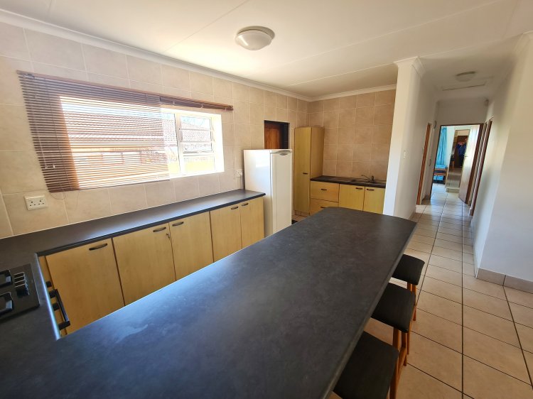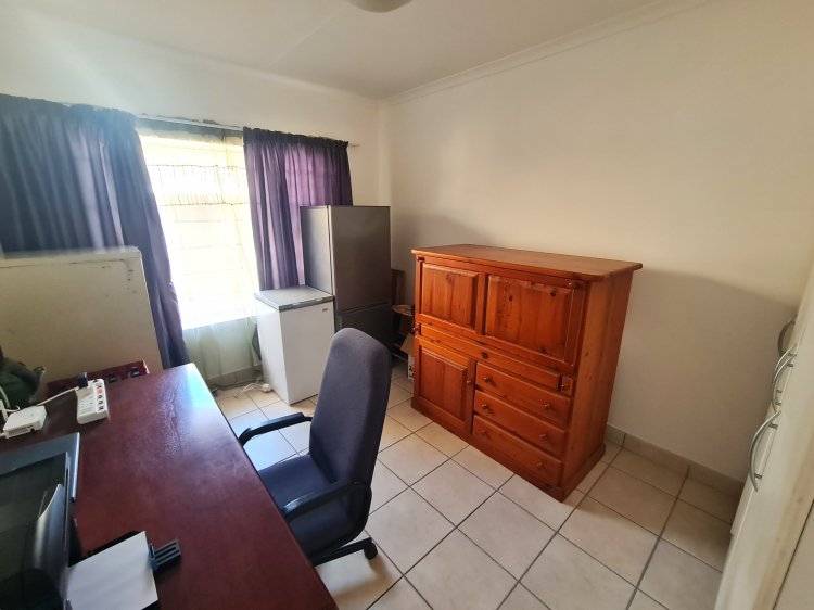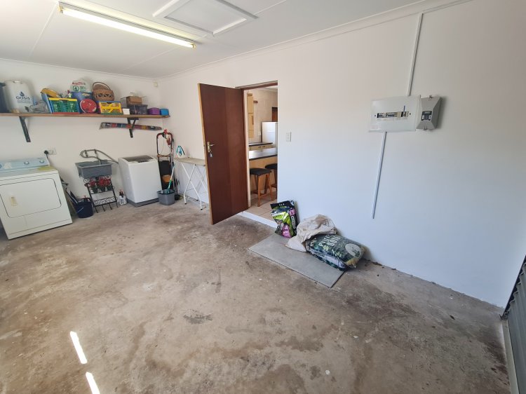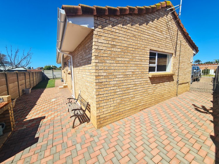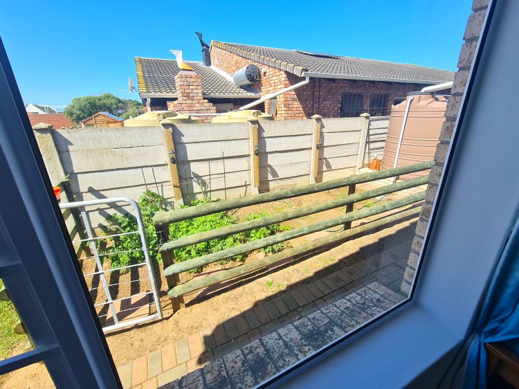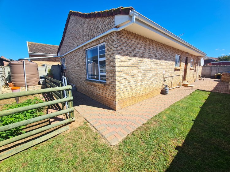 Large single garage, and a parking spot in front of the garage door. Manageable garden for your veggies and gardening interests. Brick braai and a water tank.