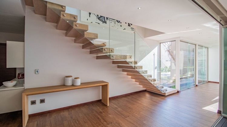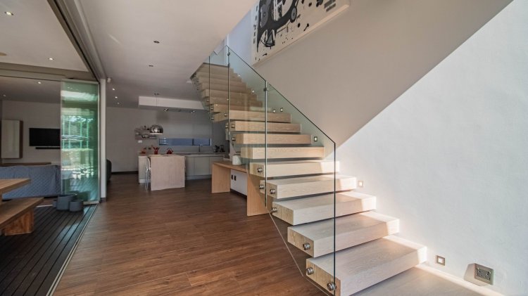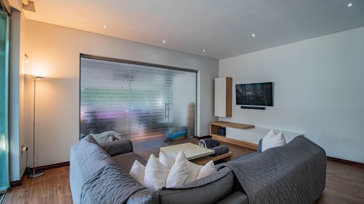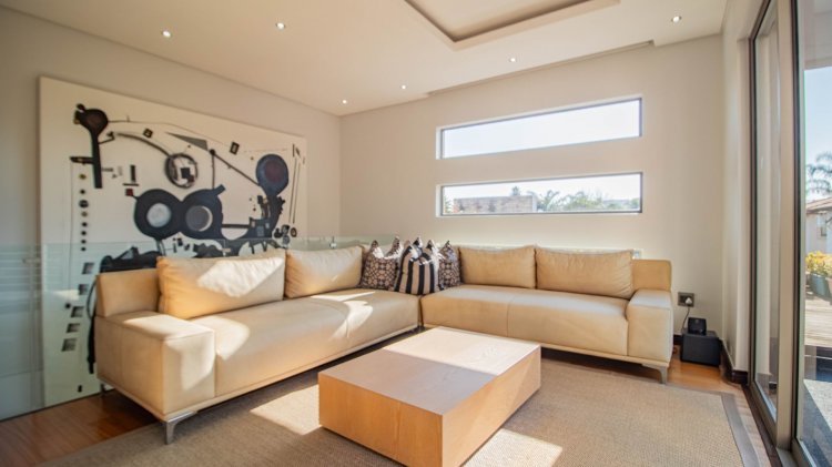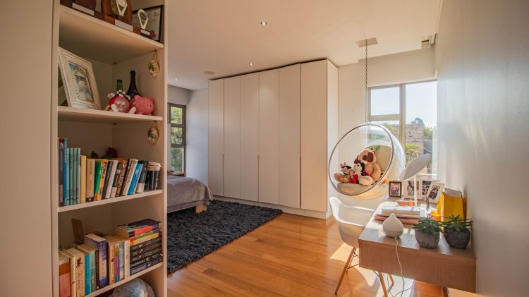 Upstairs Elegance • A striking glass and laminated staircase leading to the bedroom wing • Three spacious en-suite bedrooms with floor-to-ceiling Duco-finished cupboards • A warm and inviting family pyjama lounge