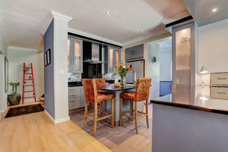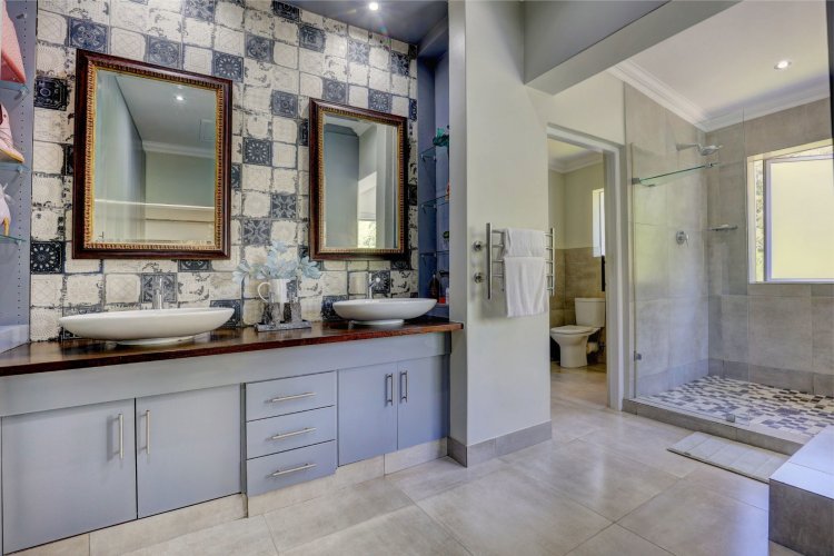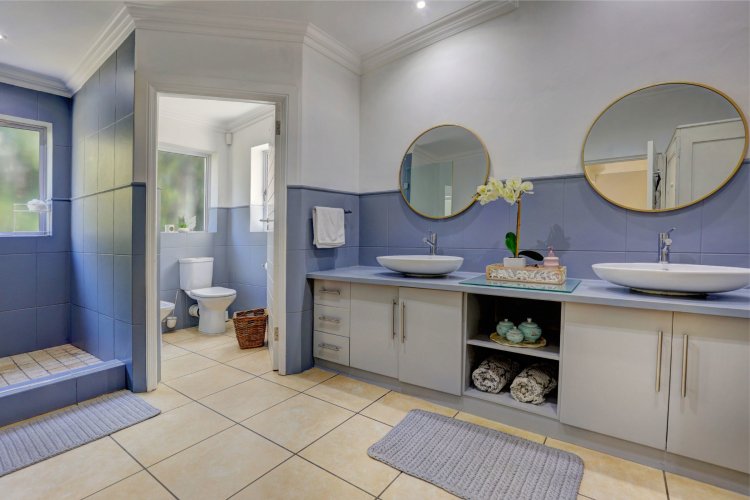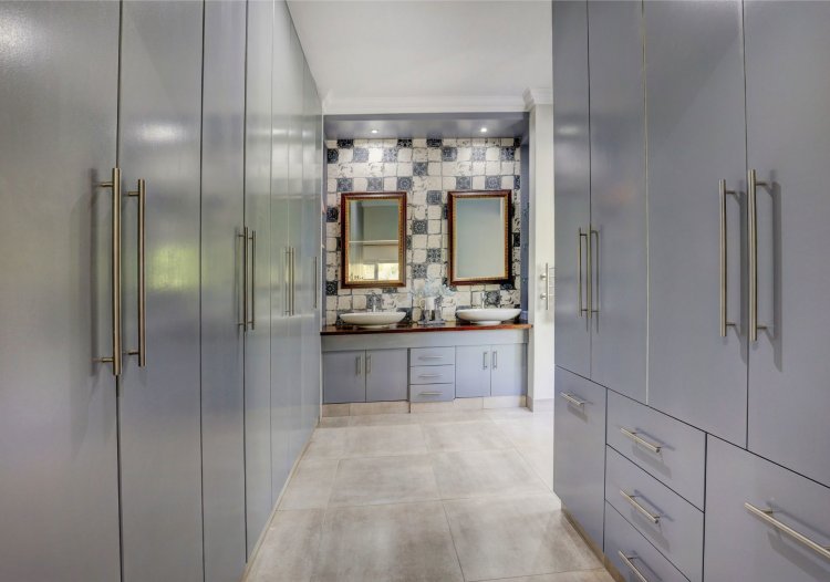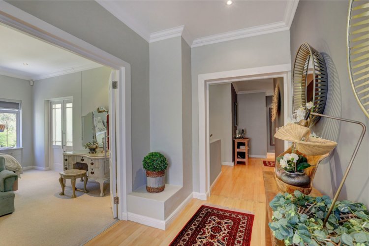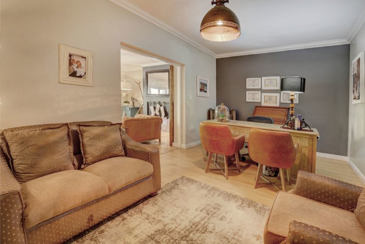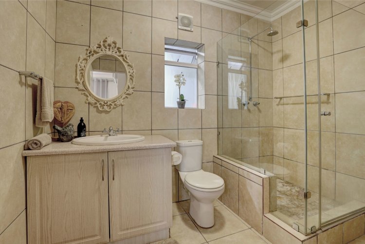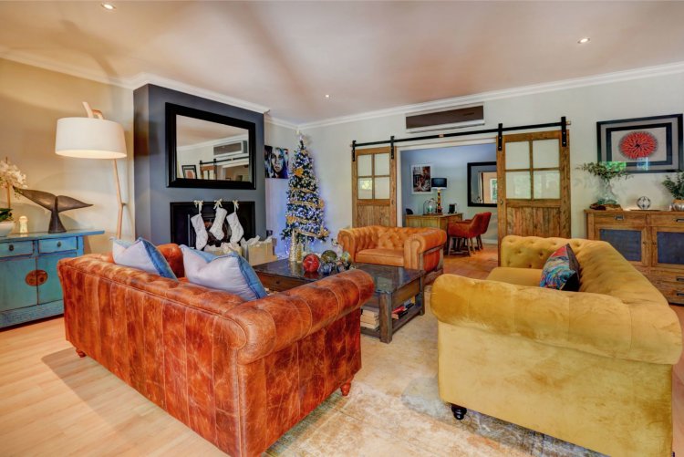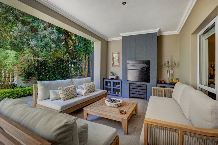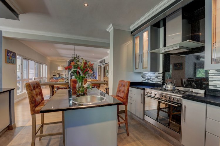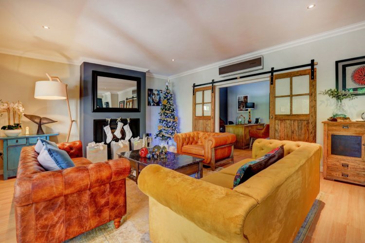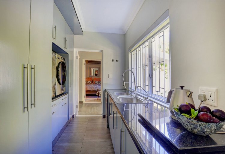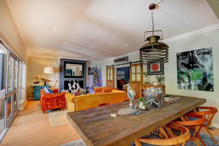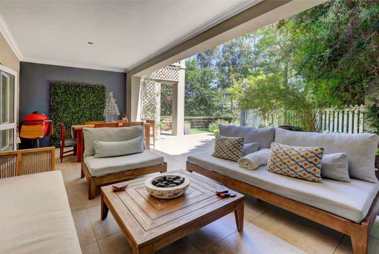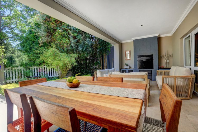 This home is designed for both family living and is an entertainers' paradise. The home features an open plan lounge, dining area with a cozy fireplace, flowing seamlessly through stacker doors to a covered patio with built in braai. The open plan dining area is ideal for hosting guests, while the modern kitchen — complete with premium Smeg stove with gas hob and electric oven, breakfast nook, and separate scullery/laundry — blends style with functionality. The covered patio, overlooking the immaculate garden and water feature, sets the scene for relaxed gatherings.