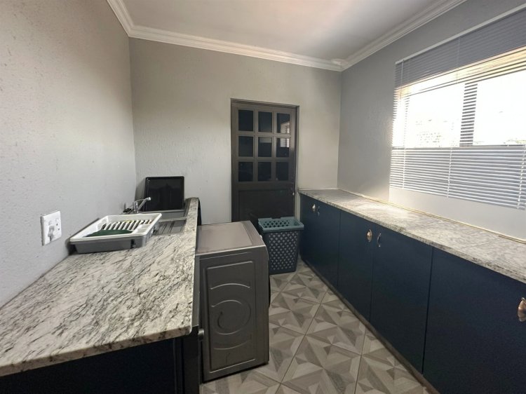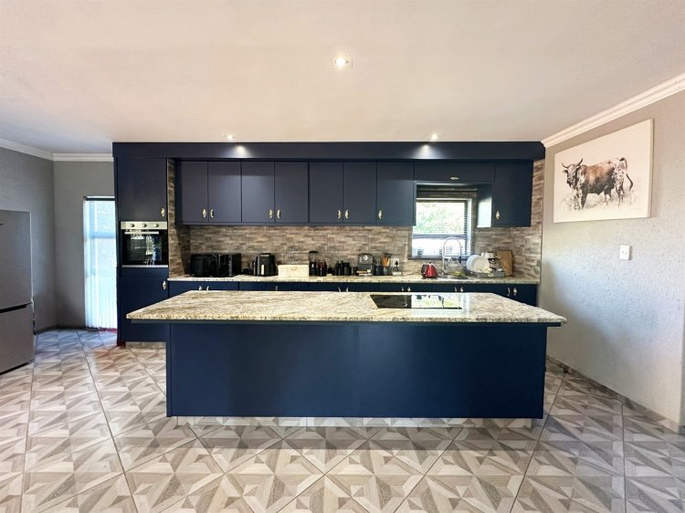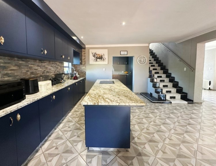 This spacious home in Kampersrus offers generous living areas and exceptional mountain views throughout. The ground floor features a flowing open-plan layout with a comfortable lounge, dining area, and a beautifully finished kitchen. The kitchen includes extensive wooden cabinetry, a central island for additional workspace, and a separate scullery. A guest toilet is also situated on this level. Large windows frame the surrounding scenery, filling the home with natural light.
