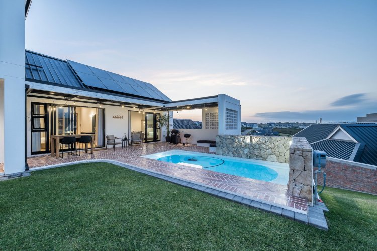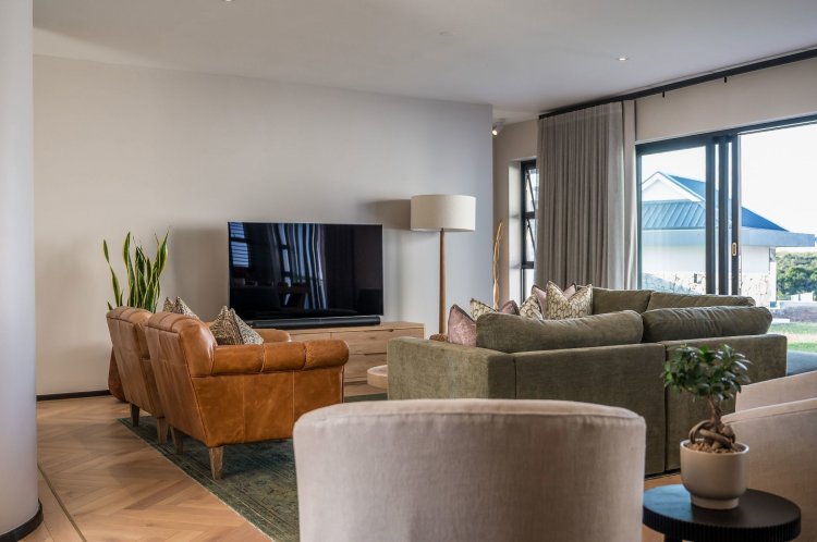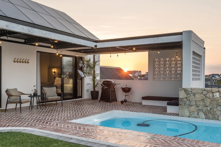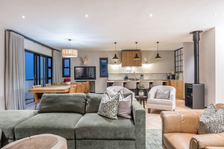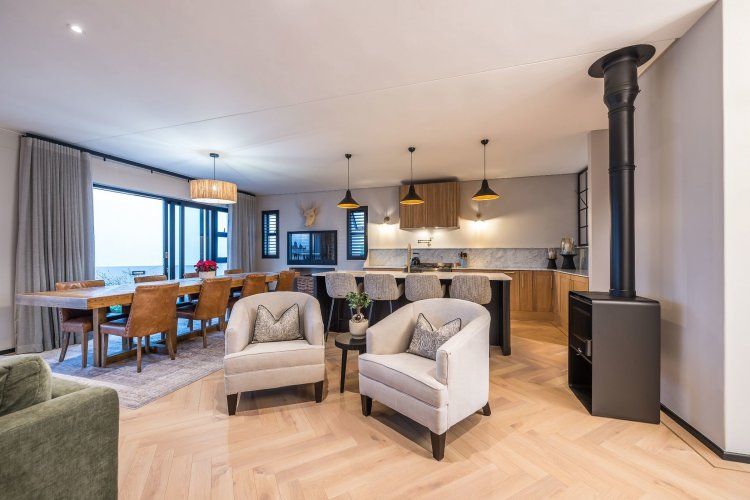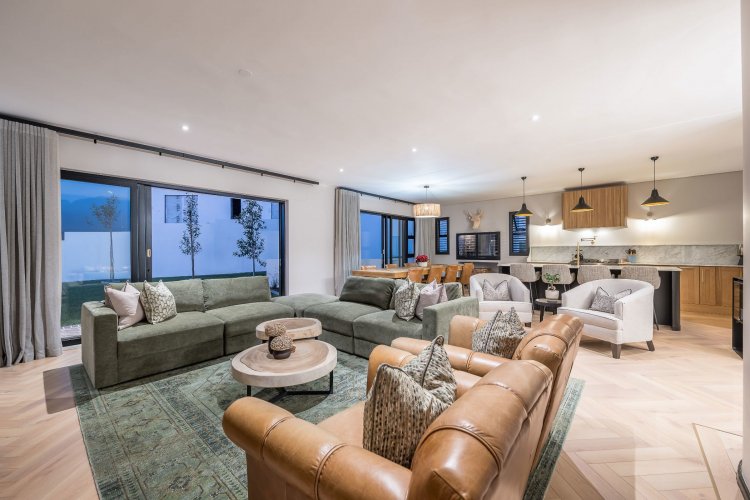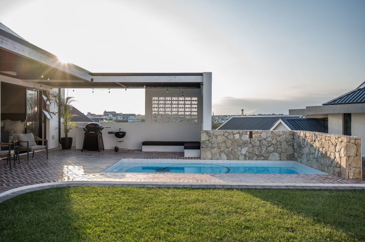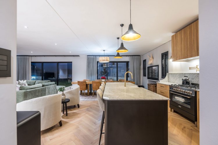 Open plan living area with family kitchen and indoor braai area leading out onto patio and garden with swimming pool.