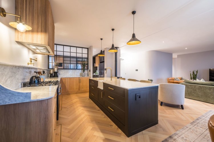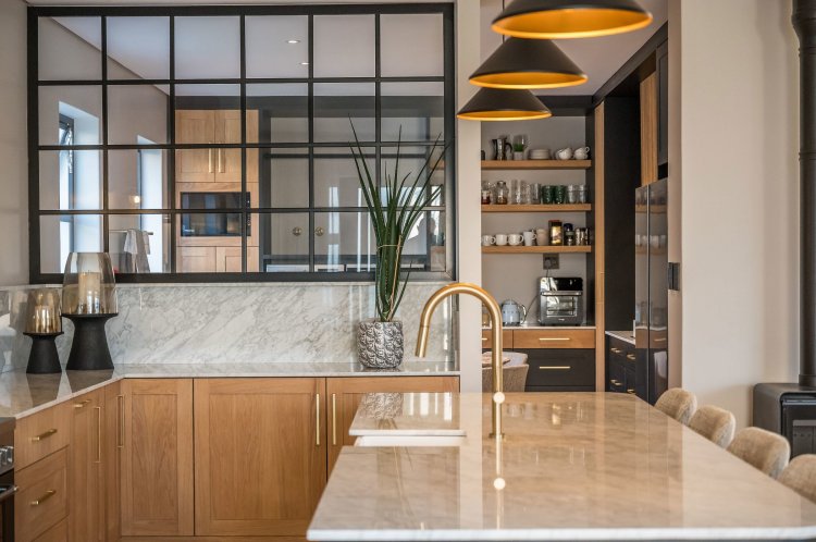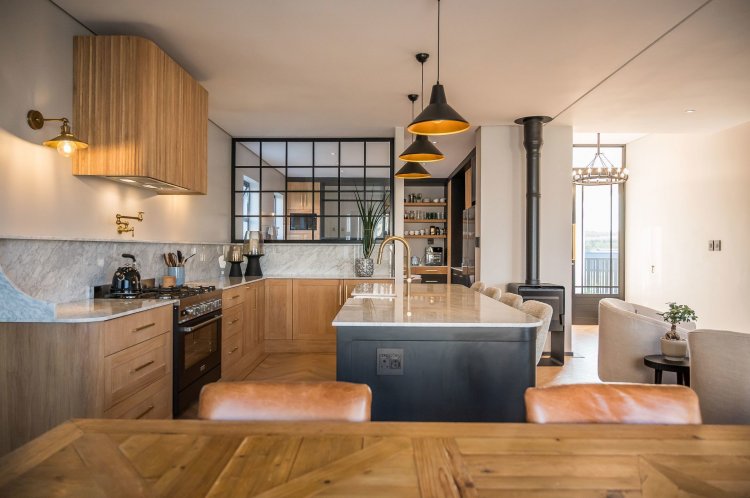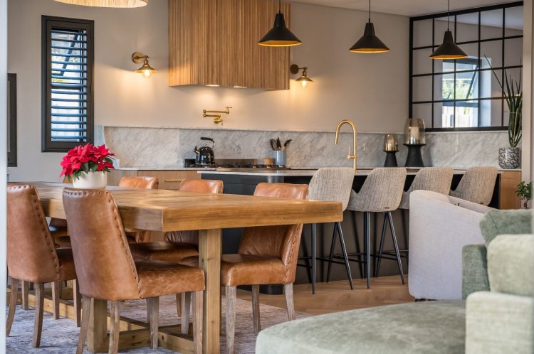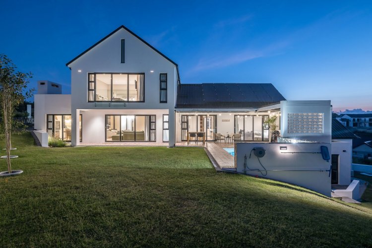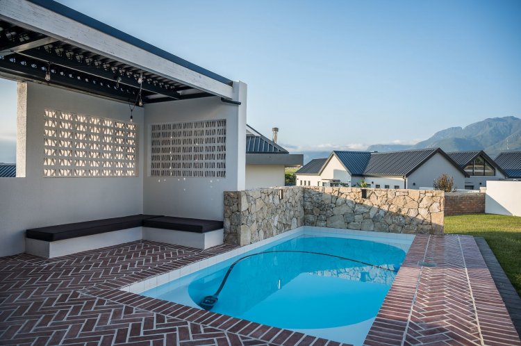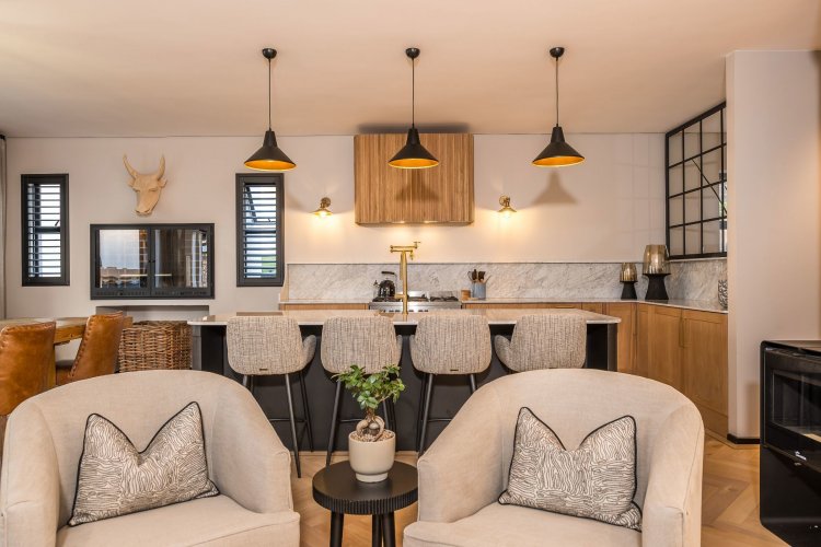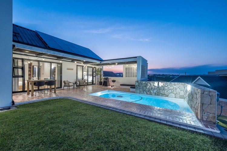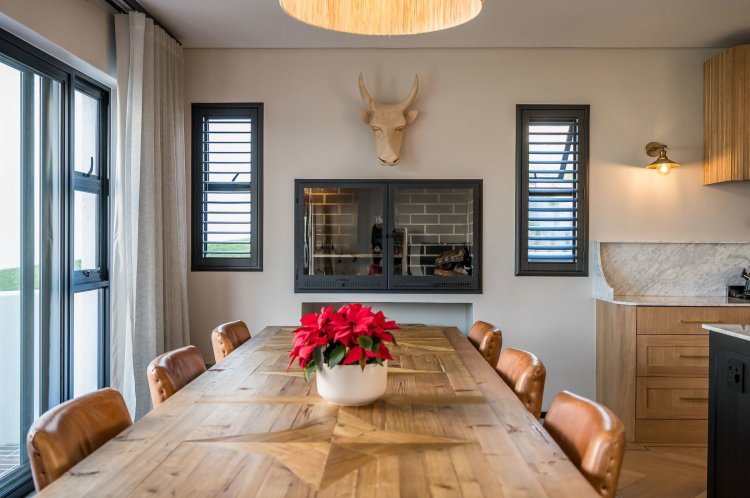 Open plan living area with family kitchen and indoor braai area leading out onto patio and garden with swimming pool.