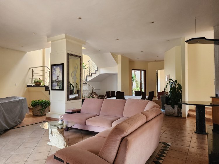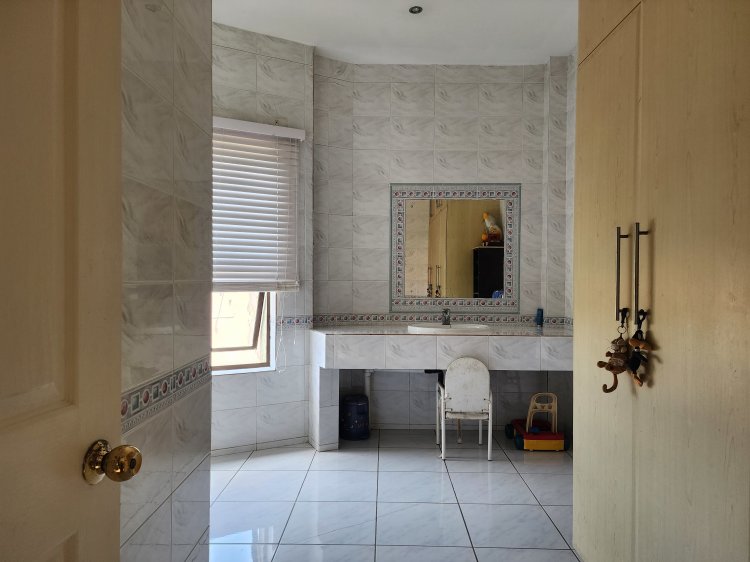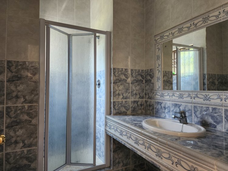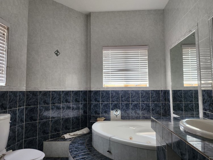 The well-appointed kitchen features granite countertops, a breakfast nook, and ample fitted cupboards — designed for both functionality and effortless entertaining. The living areas flow seamlessly onto a spacious patio overlooking the sparkling pool and landscaped garden. Whether hosting guests or enjoying a quiet afternoon, the indoor-outdoor flow and sea views make this space truly special.