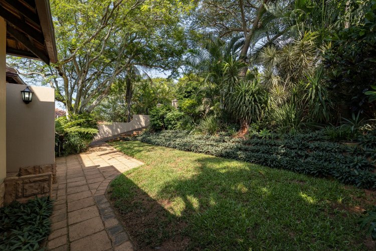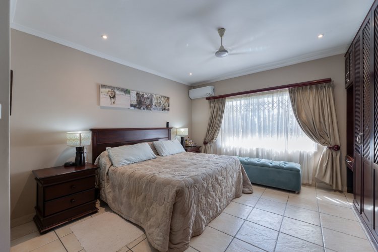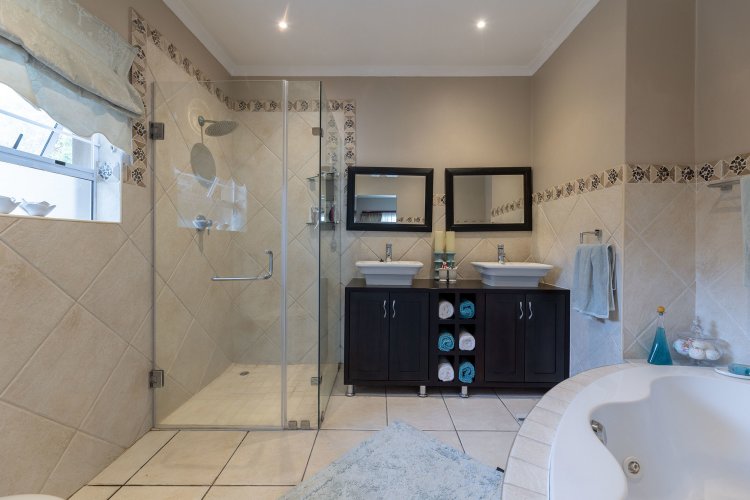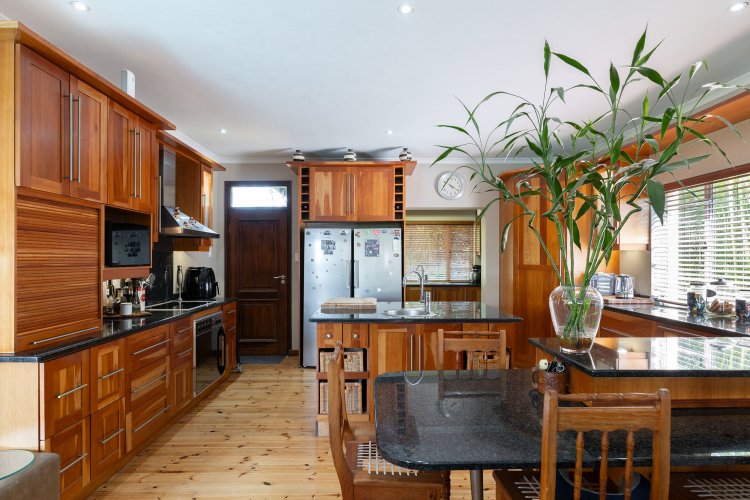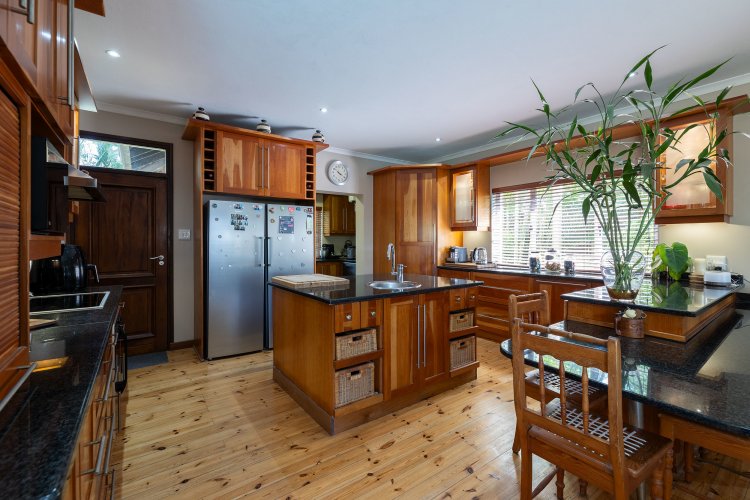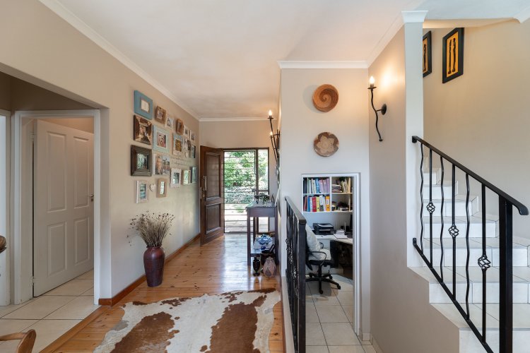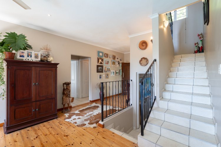 The expansive lounge overlooks the inviting pool and blends seamlessly with the dining room and open plan kitchen. The flow continues through to the fitted bar and outdoor entertainment area with a built-in braai overlooking the sparkling pool, truly an entertainer’s dream. The beautifully appointed kitchen, complete with a scullery, features elegant cherry wood cabinetry and sleek granite countertops. For added convenience, a guest powder room and a private study are located on this level. The spacious ground-floor master suite, fitted with ample built-in cupboards, overlooks the sparkling pool and garden. It includes a luxurious full bathroom, creating a peaceful retreat.