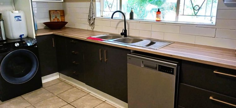 The modern, spacious kitchen is well equipped with a gas/electric stove, extractor fan, dishwasher- and washing machine connections, a double basin, and ample cupboard space.