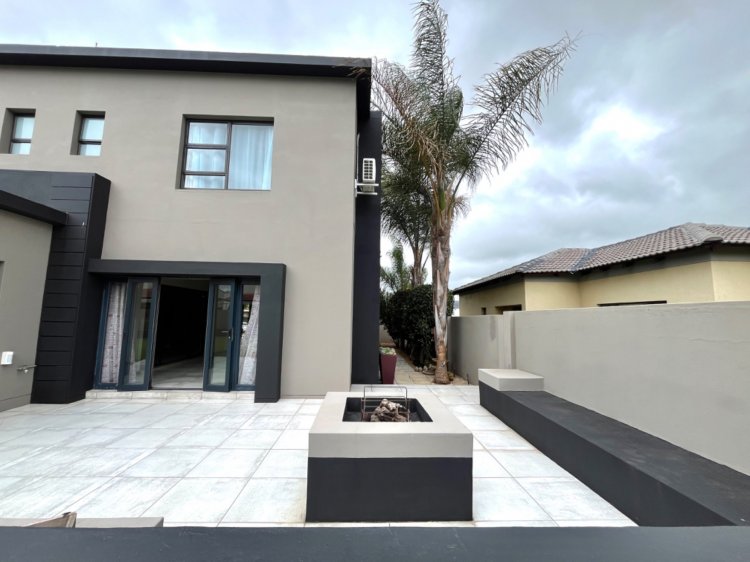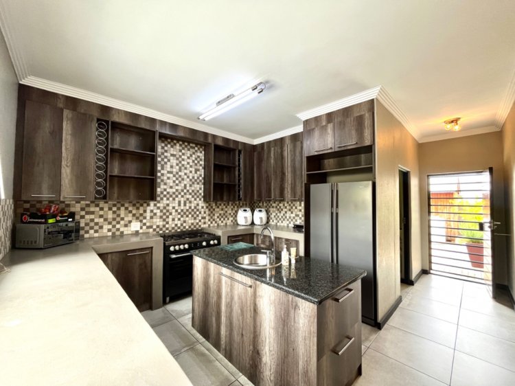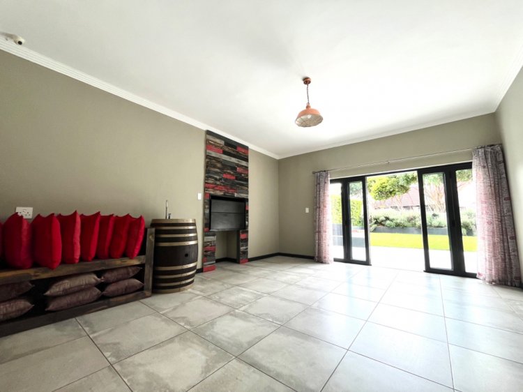 Living spaces flow seamlessly, with an open plan kitchen and living area designed for effortless everyday living and entertaining. The kitchen offers ample storage, a centre island, gas cooking, and a walk-in pantry, supported by a separate scullery. Sliding doors lead to a covered patio and an indoor braai area, creating a perfect indoor-outdoor lifestyle.