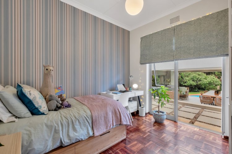 Upstairs, a private guest suite with its own bathroom that features a shower, basin with Caesarstone vanity offers lovely views over the garden and pool — perfect for visitors or extended family.