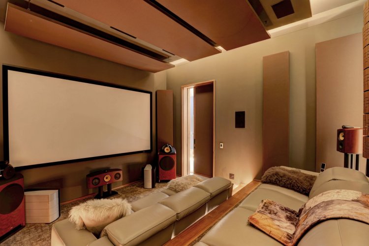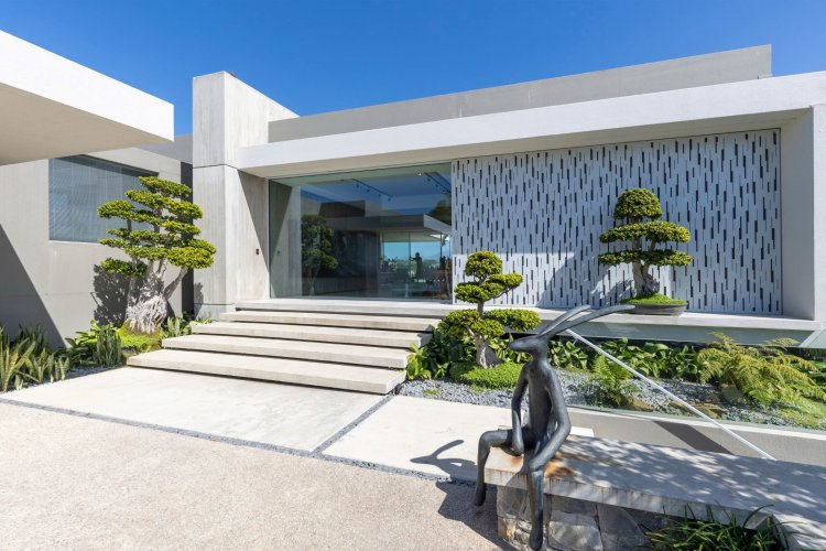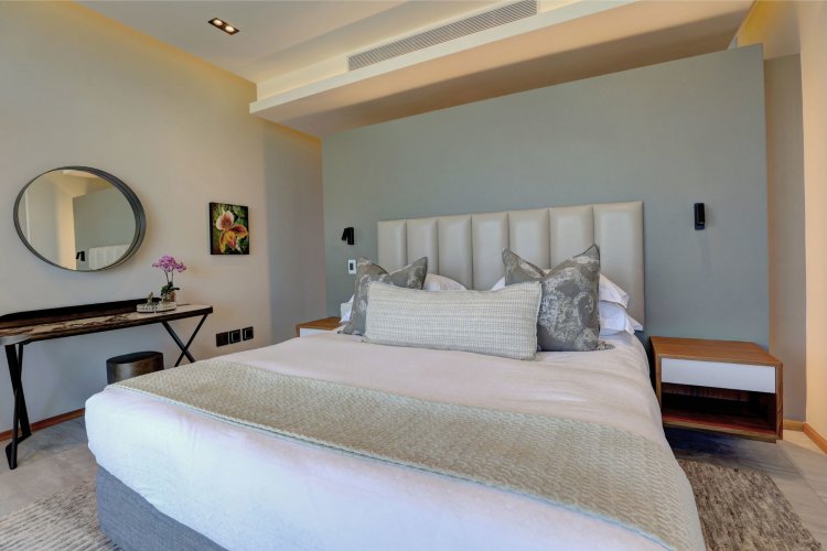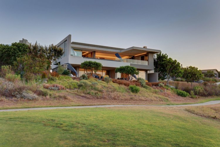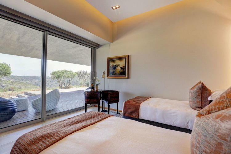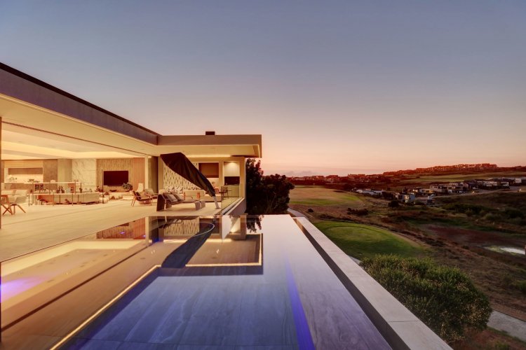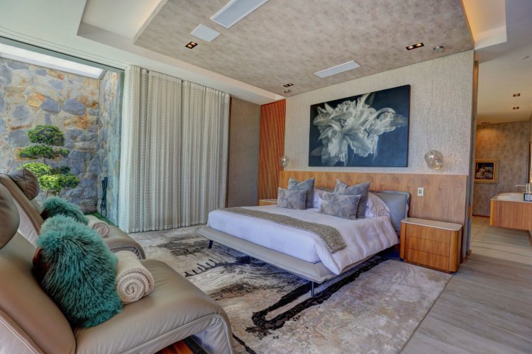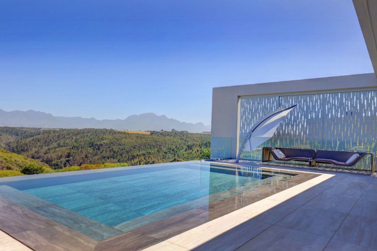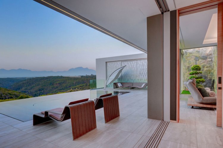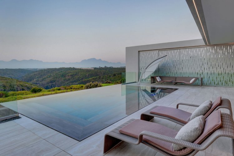 Additional features include a fully equipped external one bedroom suite, landscaped indigenous gardens supported by four 5 000 litre water tanks, underfloor heating, heated towel rails, an advanced music system, automated lighting, and comprehensive home automation linked to the owner ' s mobile device. The lower level lounge includes its own full kitchen, while the cinema room offers premium Natuzzi seating and advanced acoustics.