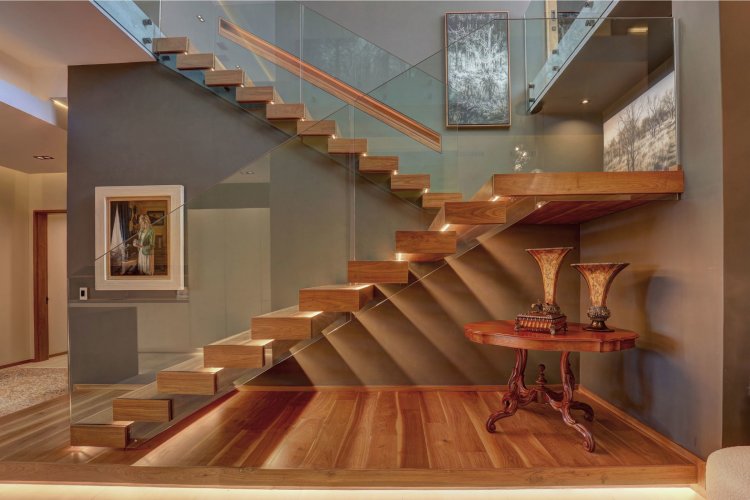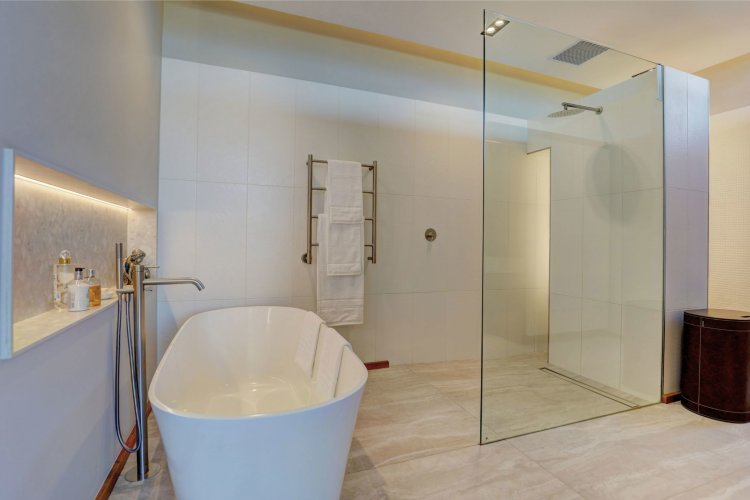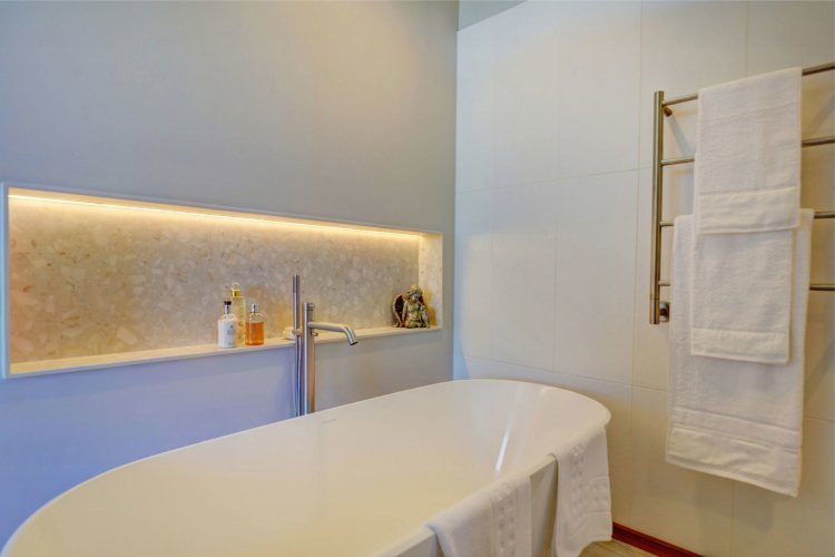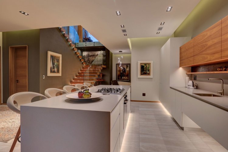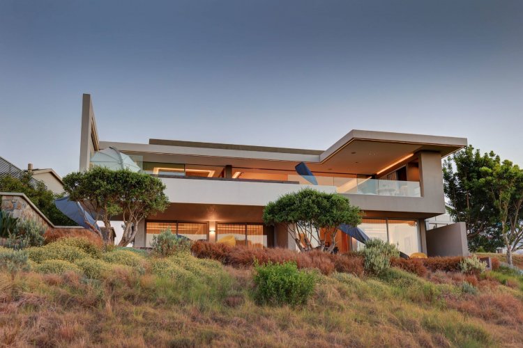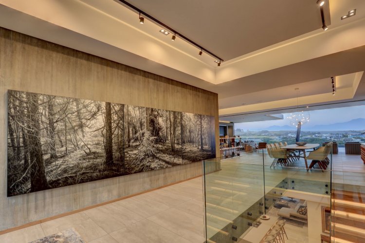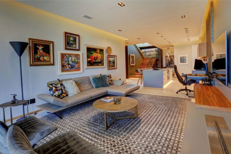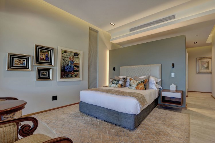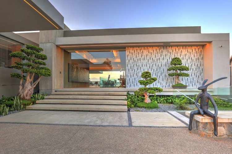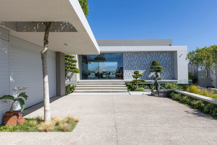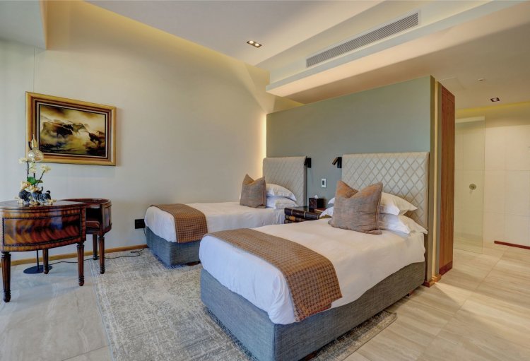 Additional features include a fully equipped external one bedroom suite, landscaped indigenous gardens supported by four 5 000 litre water tanks, underfloor heating, heated towel rails, an advanced music system, automated lighting, and comprehensive home automation linked to the owner ' s mobile device. The lower level lounge includes its own full kitchen, while the cinema room offers premium Natuzzi seating and advanced acoustics.