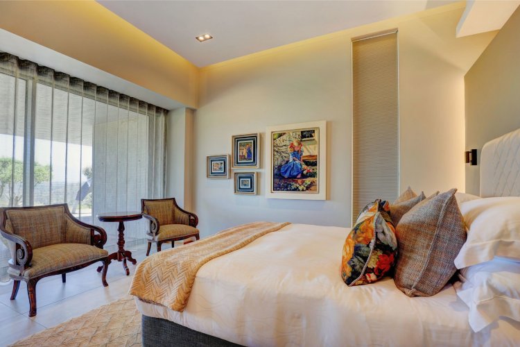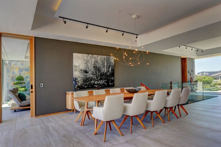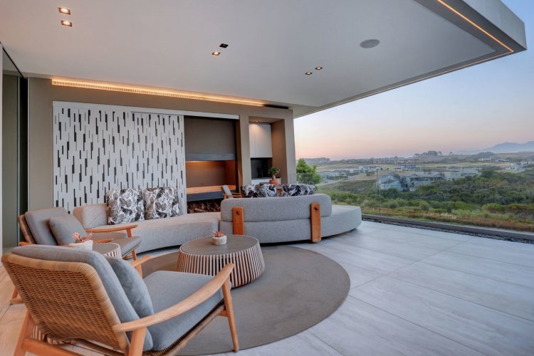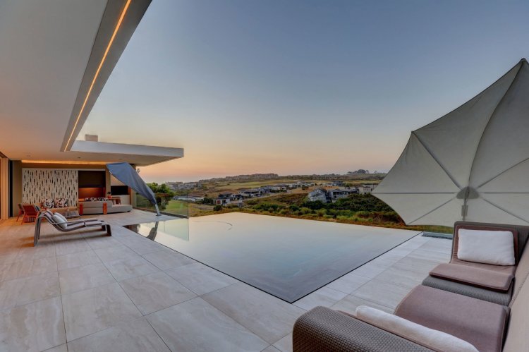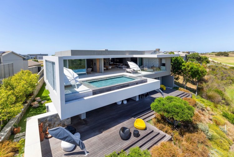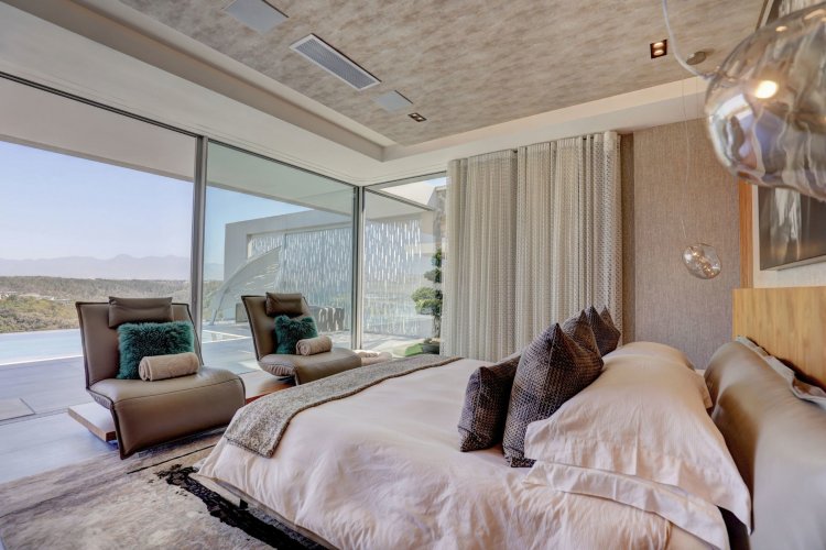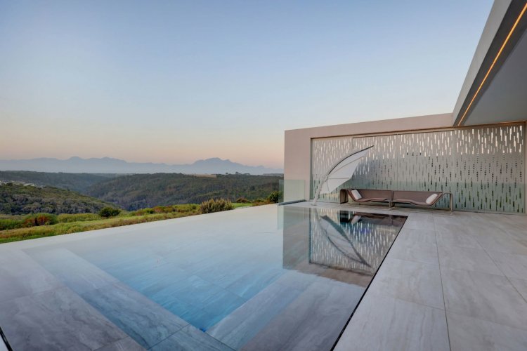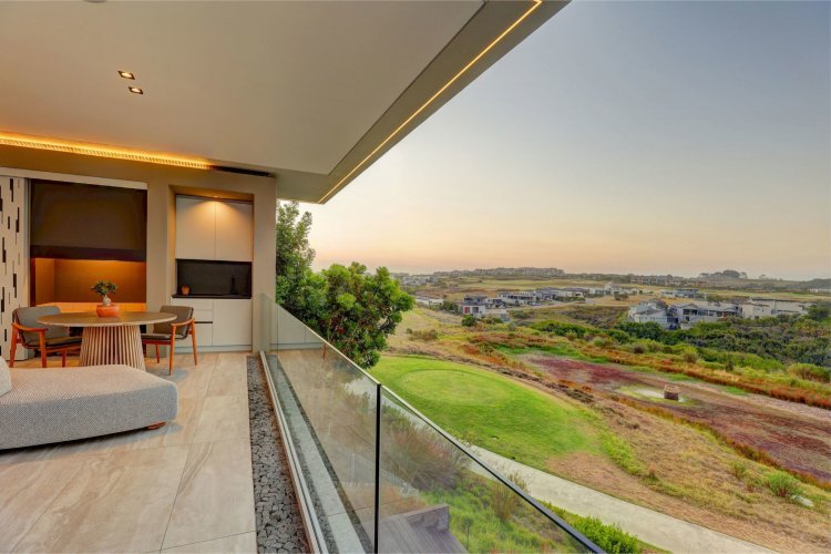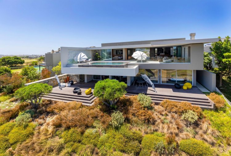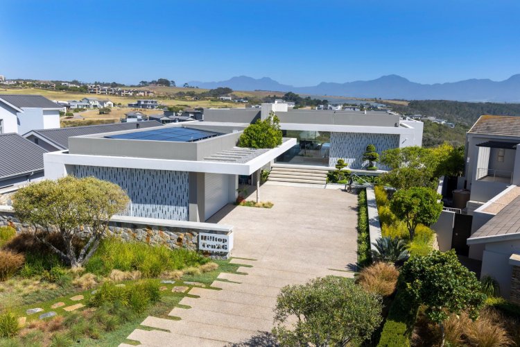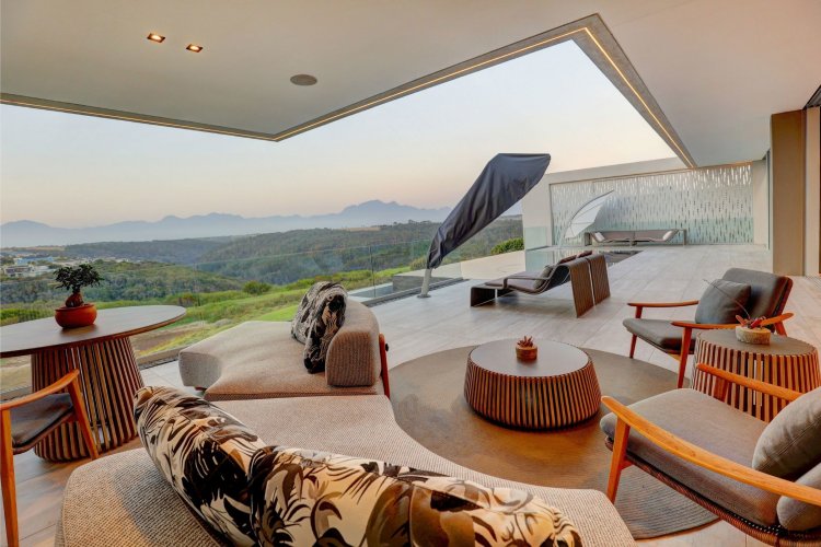 Crafted with intention and designed to breathe, this distinguished hilltop residence in the prestigious Oubaai Golf Estate offers an extraordinary connection to nature. Overlooking lush fairways, serene valleys and the iconic Outeniqua Mountains, the home welcomes you through remote controlled glass doors into a sanctuary where light, texture and space are meticulously balanced. Minimalist elegance is expressed through curated finishes, layered wall textures and a seamless flow between indoor and outdoor living.