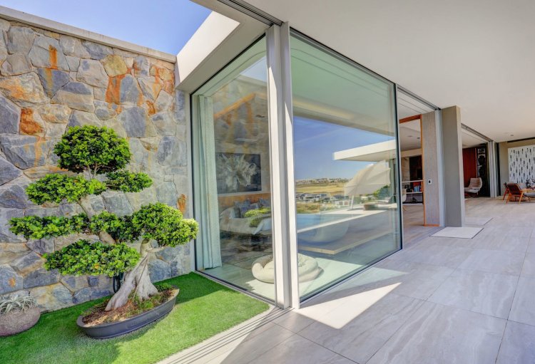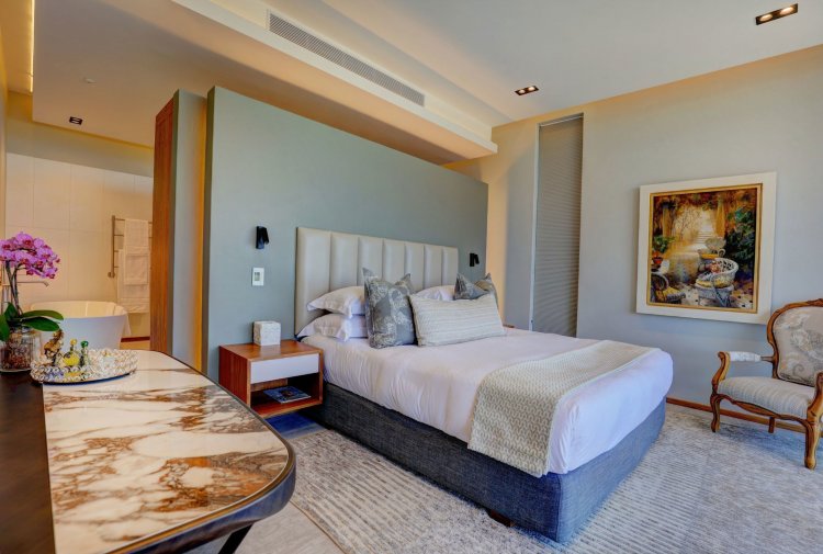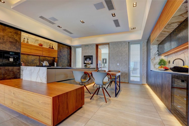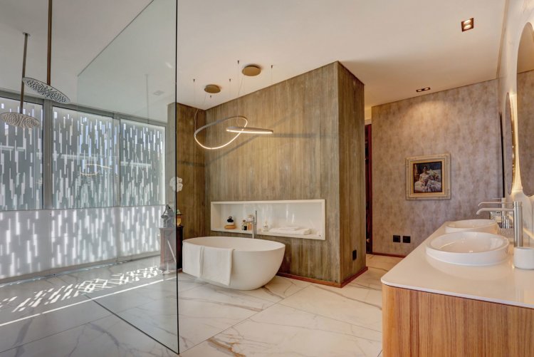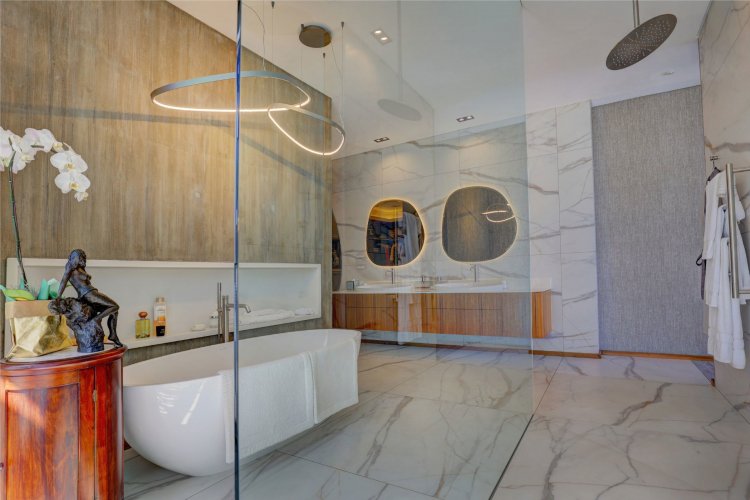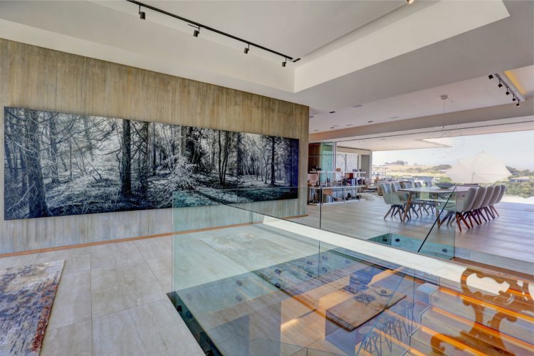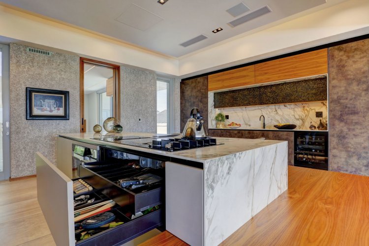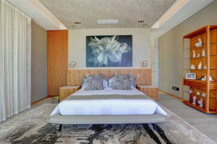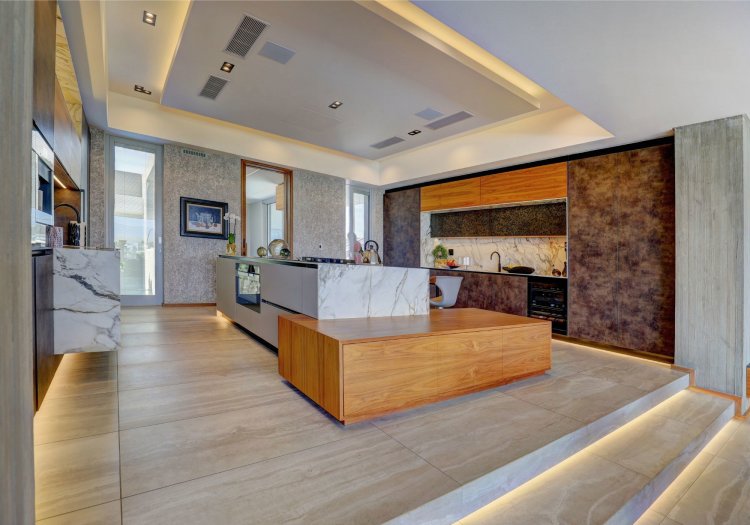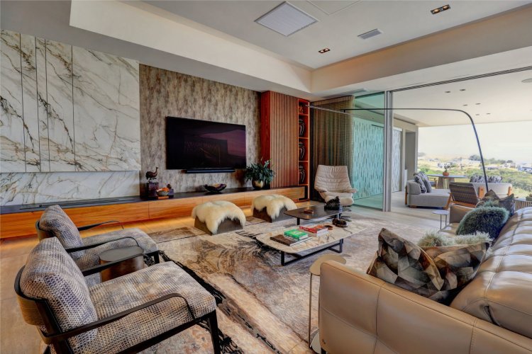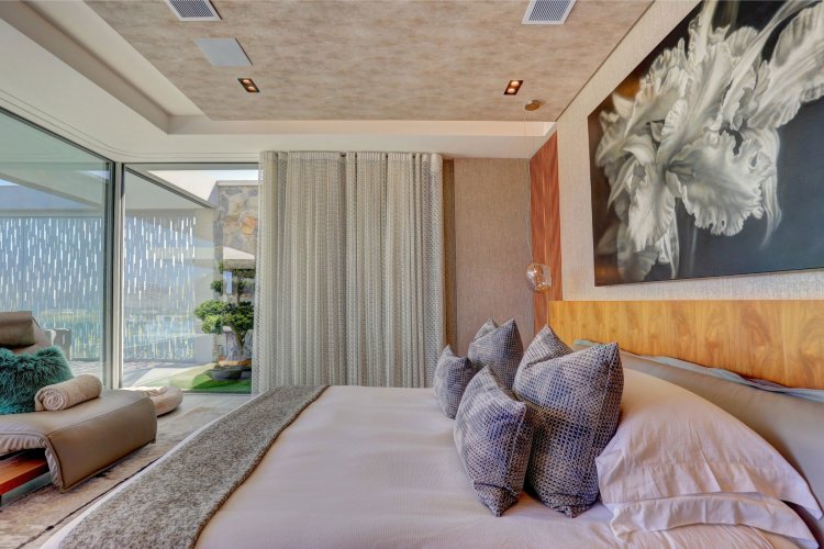 Double glazed glass throughout, with selected panels featuring integrated remote controlled blinds, enhances comfort and efficiency. The gourmet kitchen—designed in collaboration with De Steyl—features custom cabinetry, imported Miele appliances, a teppanyaki grill, glass gas hob, built in fridge/freezers, concealed brass fronted storage, a dedicated wine cupboard and three ovens including a steam oven. A built in cappuccino machine and additional hidden luxuries elevate the culinary experience.